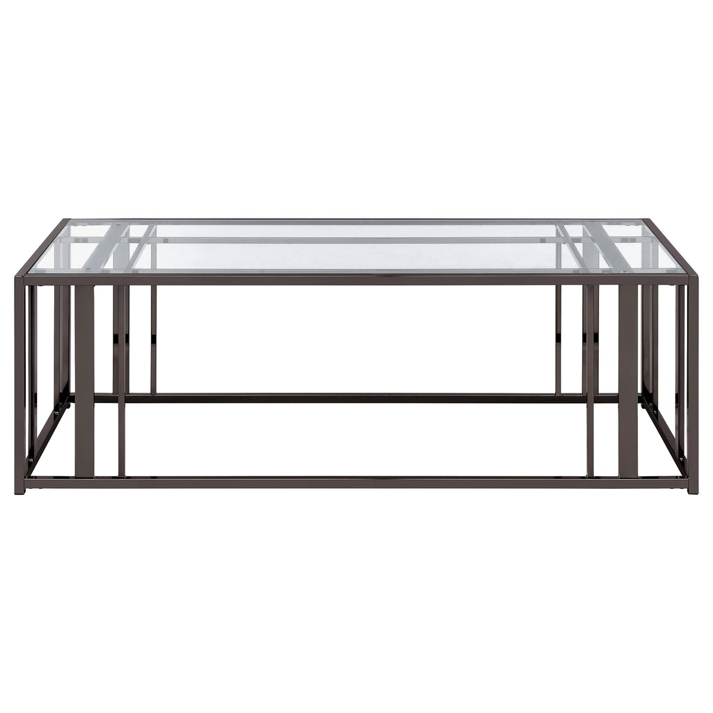 This coffee table set includes a rectangular coffee table and a matching end table, both featuring tempered glass tops and geometric bases crafted from heavy-gauge metal. The open-frame design exudes modern elegance while offering durability and functionality. Scratch-resistant materials ensure lasting quality, making the set ideal for organizing essentials or displaying decor. Its cohesive design provides a sleek, contemporary look for any living room.