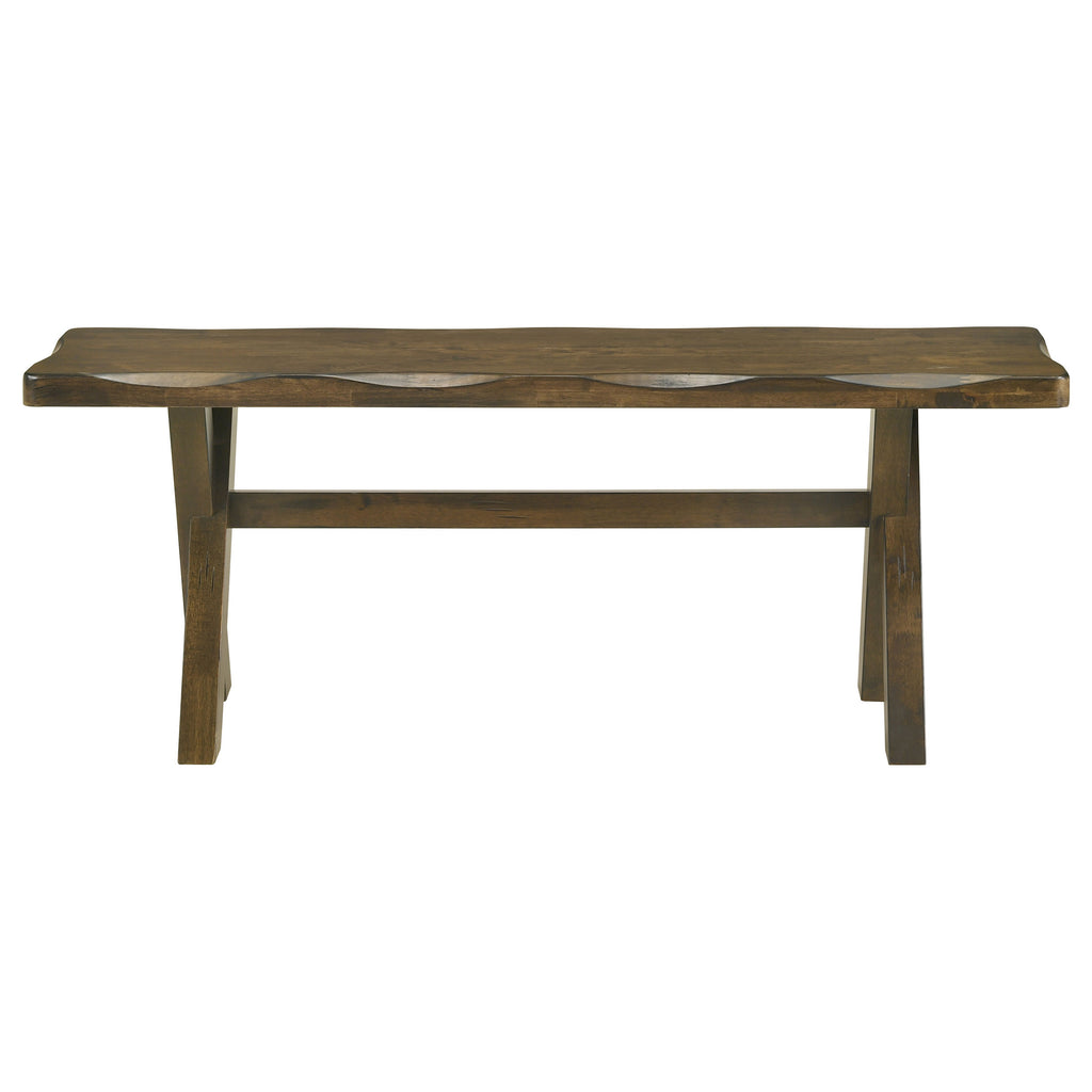 A fine 5-piece dining set that features a table and four side chairs will be centerpiece for any home. The table is constructed in craftsman style from solid Asian wood and coated in a Knotty Nutmeg finish. Smooth edges and slight curves throughout highlight its sleek style. The four side chairs feature slatted seat backs and fabric upholstery that matches the table in style. Enjoy hours of great food and lots of laughs with loved ones with this fantastic set.