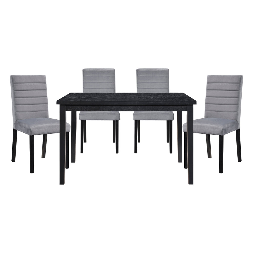 The design of the Andreas Collection is scaled to seat four, making this modern dinette group the perfect addition to your casual dining space. A black finish is utilized over ash veneer highlighting its distinct veneer. Grey upholstered chairs are paired with the table, each featuring horizontal contouring and modern lines.