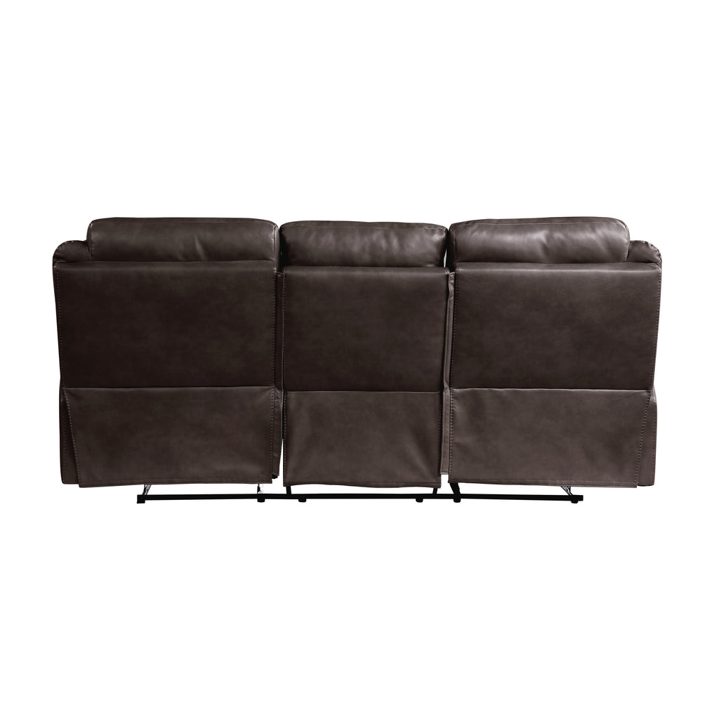 With amply appointed offerings that create not only a comfortable seating experience but a functional one as well, the Aram Collection will be a welcome addition to your home. Dark brown breathable faux leather covering for comfort and style that will blend effortlessly with your transitional decorative preference. Manual motion mechanisms operate with the pull of a side-mounted tab, that once engaged, take you from seated to reclined in an easy motion. Each piece in the collection has an individual function allowing for convenience and comfort. The sofa features dual reclining ends and a drop down center seat back with cup-holders, electric receptacles, USB port and tabletop space, the dual glider reclining ends of the love seat flank a center mounted console with storage, electric receptacles and cup-holders, and the reclining chair features a glider mechanism that allows for easy back and forth motion.