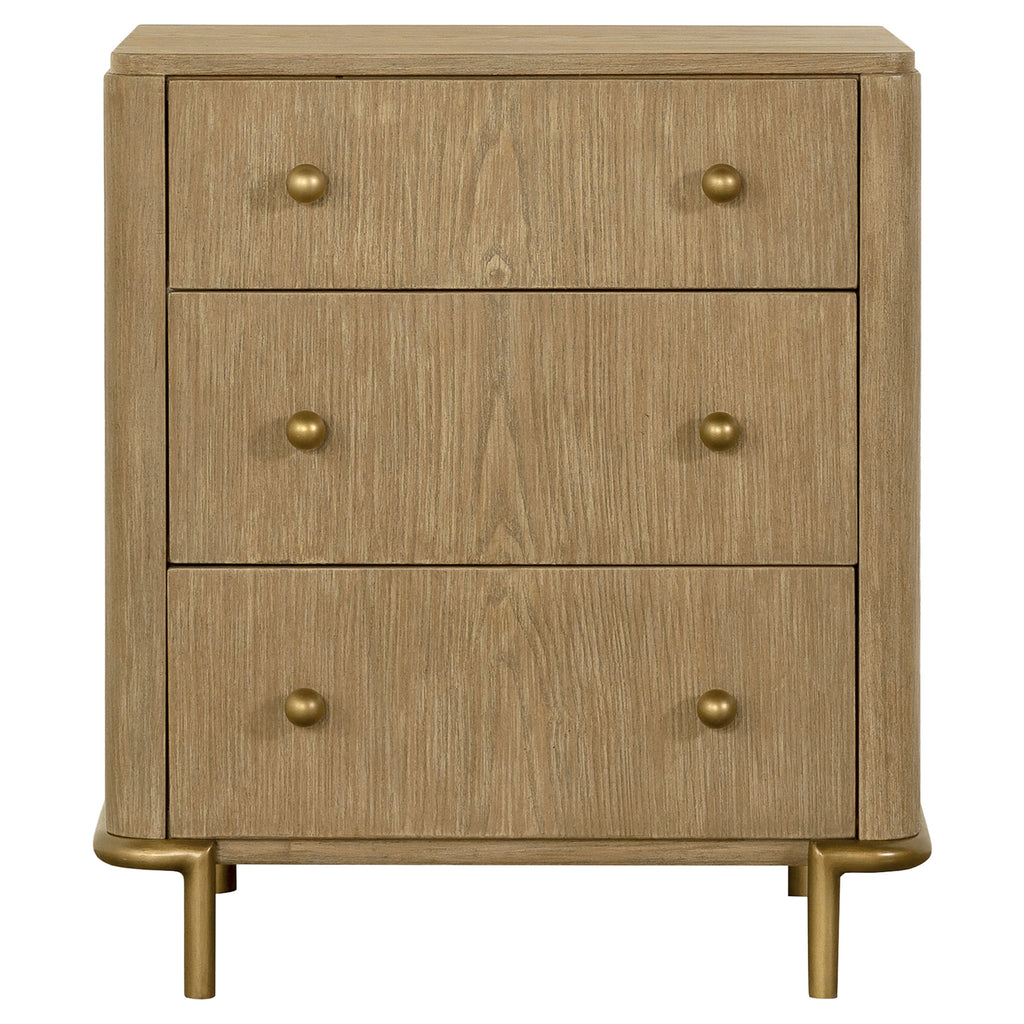 Create an elegant, natural retreat with this mid-century modern bedroom set. The design features a warm sand wash finish achieved through an eleven-step wire-brushed process for subtle texture and organic tone. Woven cane panels lend an airy, handcrafted feel, framed by solid wood and metal accents in aged brass. Smooth curves and clean lines define each piece, combining refined craftsmanship with modern functionality to bring a calming, sophisticated presence to any bedroom space._x005F_x000D_ Key Features: • Bedroom set in natural organic style design accented with refined glamorous touches • Finished in an eleven-step wire brushed sand wash color for soft, rustic character • Bed crafted with solid wood, metal, and open cane panels for a fresh modern trend • Case pieces provide generous storage with aged brass finished metal base supports • Nightstand includes dual USB recharging ports for added modern functionality • Mirror features an integrated shelf designed to keep jewelry and accessories handy