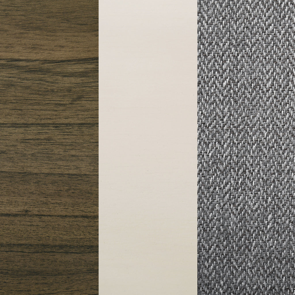 Refresh a family dining space with the cool hues and eye-catching design of this modern dining set. It includes a rectangular table and side chairs, creating an inviting centerpiece in your dining room or eat-in kitchen. The table boasts a two-tone finish with a rich wood grain tabletop complete with rounded corners, and a white finish base with chic angularity. Chairs are plush and comfortable, complete with gray fabric upholstery over plush cushions that create streamlined aesthetics in your space. The tri-tone combination is fresh and inviting, perfect for a welcoming space to catch up with friends and family. Key Features: • Complementary colors and engaging design highlight a modern rectangular dining table and chair set • Table features a rich wood finish tabletop with rounded corners that add a sleek, inviting ambiance • Intriguing base design on the table and side chairs features a white finish, adding airy contrast • Side chairs are constructed with X seat bases and feature soft gray upholstery over cushions • Tables includes levelers on its base to ensure a stable placement on any flooring type