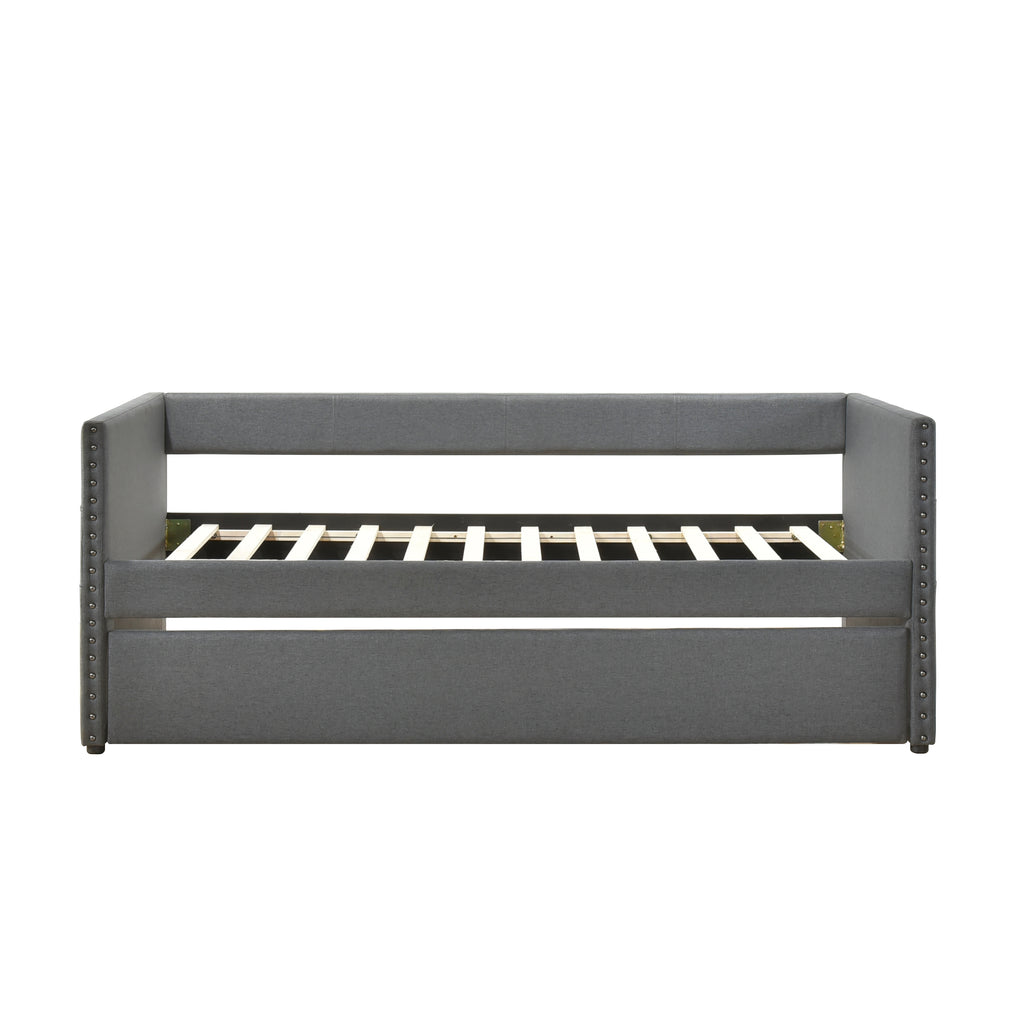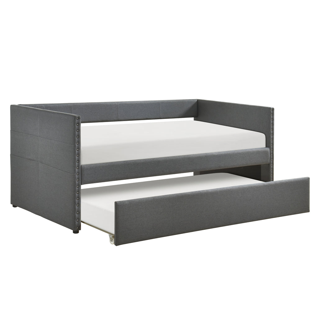 Maximize your guest room or living space with this stylish beige textured fabric daybed, featuring a convenient pull-out trundle bed for extra sleeping space. Crafted with a sturdy plywood and engineered wood frame, soft textured fabric upholstery, and elegant nailhead trim, this daybed offers both comfort and sophistication. The trundle bed, equipped with casters for easy movement, provides a seamless sleeping solution for overnight guests. Each side features convenient storage pockets for personal items. Designed to eliminate the need for a foundation or box spring, this daybed offers a sleek, modern look that complements various décor styles. Assembly is required and it ships in one box.