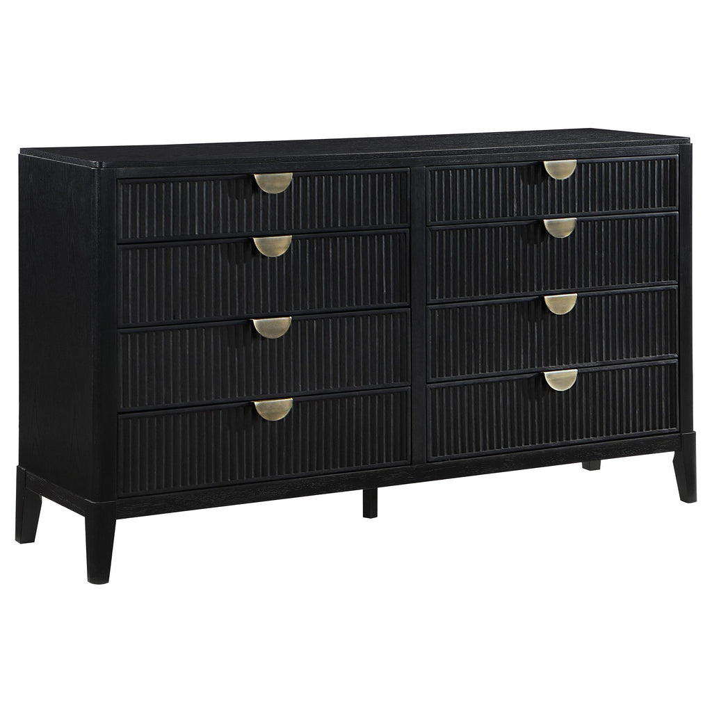 A rich black finish create a sophisticated palette for a four-piece modern bedroom set. Complete with wire brushing that creates texture, the set features fluted details that add elegance and character. The bed features an open silhouette with a low footboard, while a tall headboard centers your space. A two-drawer nightstand includes a felt lined top drawer to protect delicates like your watch or phone, leaving plenty of space in the bottom drawer for books and other essentials. The dresser and mirror set completes the look, offering plenty of storage in eight drawers, including felt lining in the top two, for clothing and accessories.