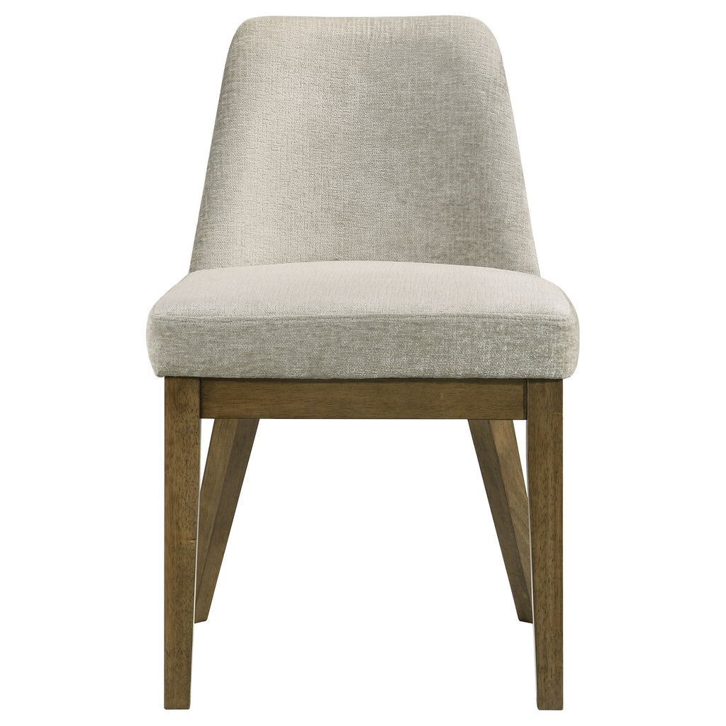 Upgrade to the inviting ambiance of this modern wooden dining set that includes a rectangular table and side chairs. It creates a warm and welcoming ambiance in your dining room, featuring a brown oak wood grain finish that pairs beautifully with light tan upholstery. Chairs feature foam cushions and a robust wood base design, augmented with tapering legs that provide ample support. The rectangular dining table features round column legs with rounded corners to create a seamless, cohesive look and feel. Choose a stylish centerpiece or lovely linens to complete the look. Key Features: • Simple and inviting, this modern wood five-piece dining set features a rectangular silhouette • Table features four round column legs for robust support and a touch of fluidity and movement • A brown oak finish over rubberwood creates a warm, natural look and feel at your table • Chairs feature a rounded back with a robust base with a matching curve and tapered legs for support • Light tan upholstery over foam complements the seat and back, offering superb comfort and support