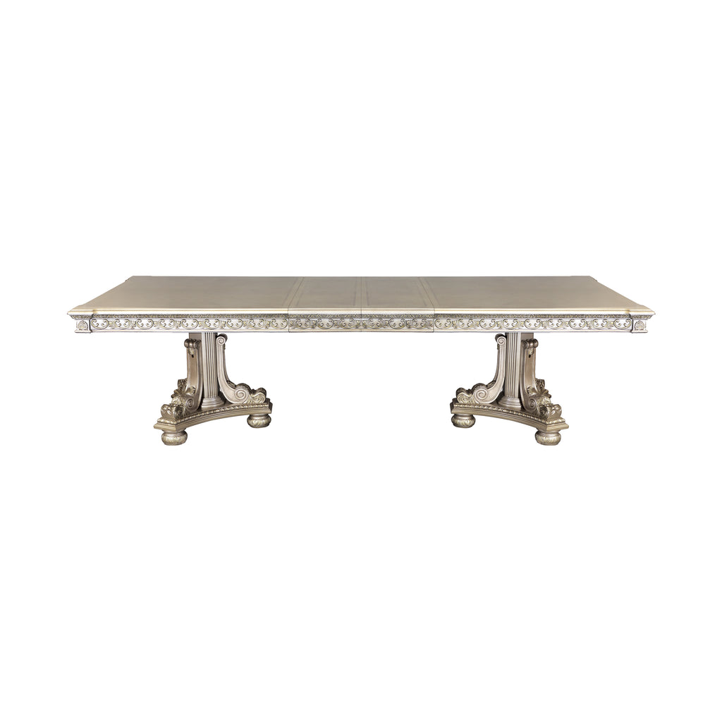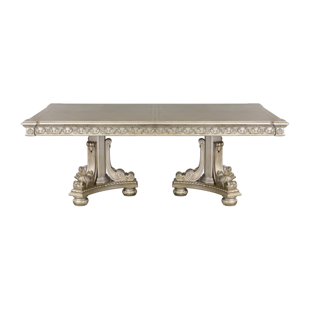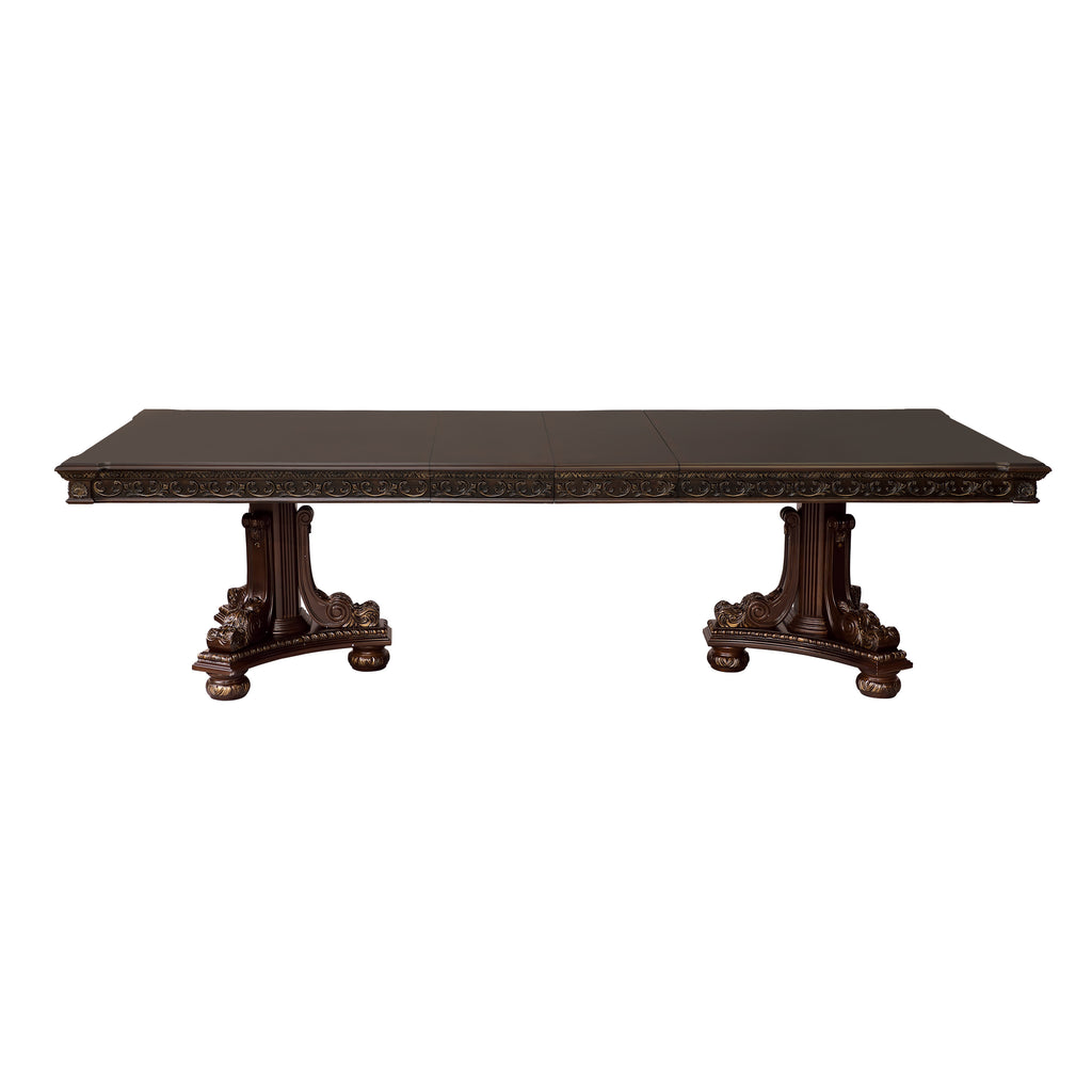 Old-World European styling is captured in the dramatically elegant Catalonia Collection. Traditional design elements reign at every turn – egg and dart molding, acanthus leaf carving, bead molding, gold tipping and extravagant carvings – creating a sophisticated look for your dining room. A traditional cherry finish is utilized to highlight the cherry veneer of the set and subtle decorative inlay pattern found on the dining table’s top.