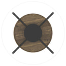 Center your living space with this inviting transitional coffee table that combines farmhouse charm with modern elegance. The X-cross frame is exposed beneath the round tempered glass top, adding dimension and visual interest. A black finish disc at the intersection of the frame offers an artistic touch, grounding the design. Below, the tray-style shelf features a warm brown wood grain finish with laminate veneer, providing both style and function with a subtle contrast to the glass and metal elements to this cocktail table.