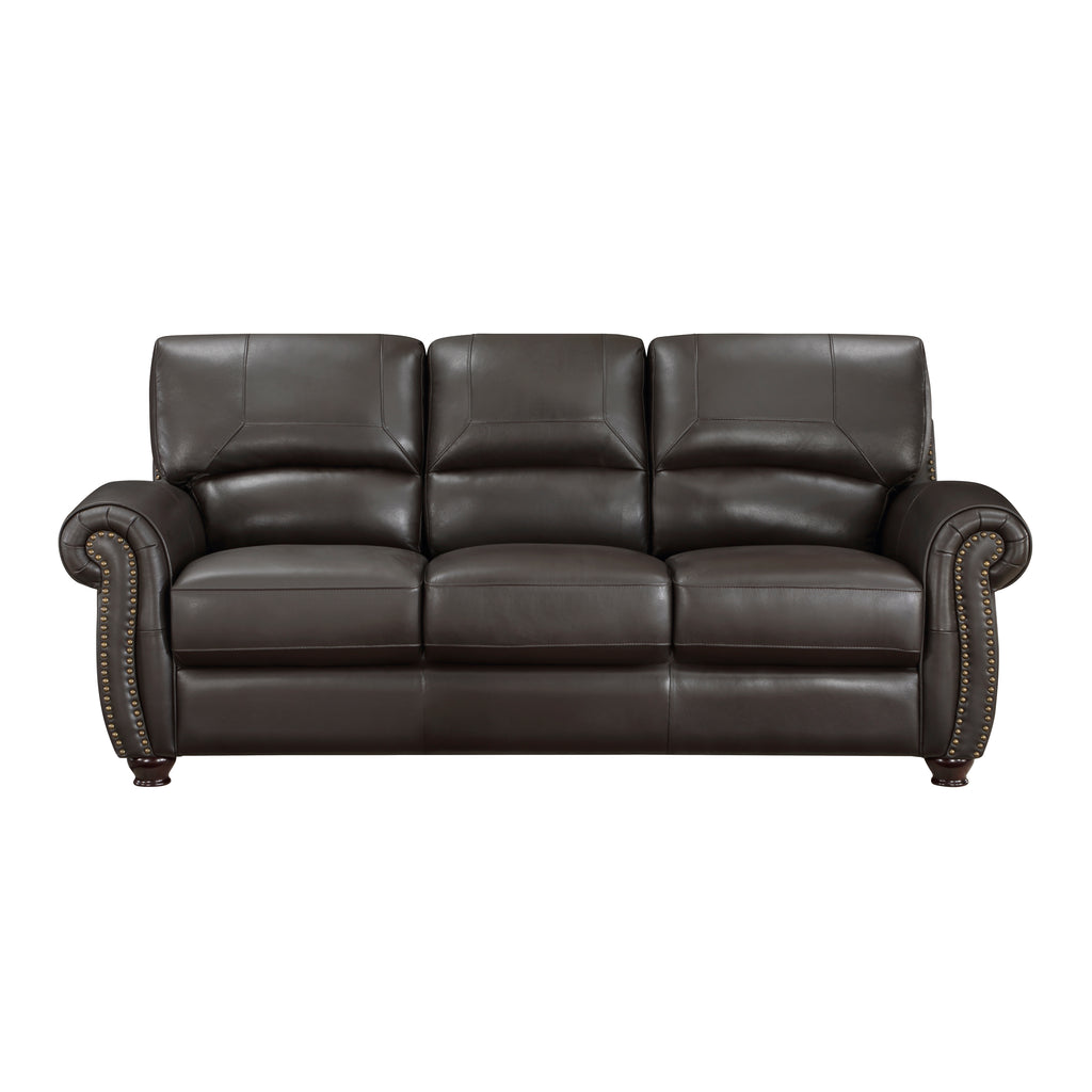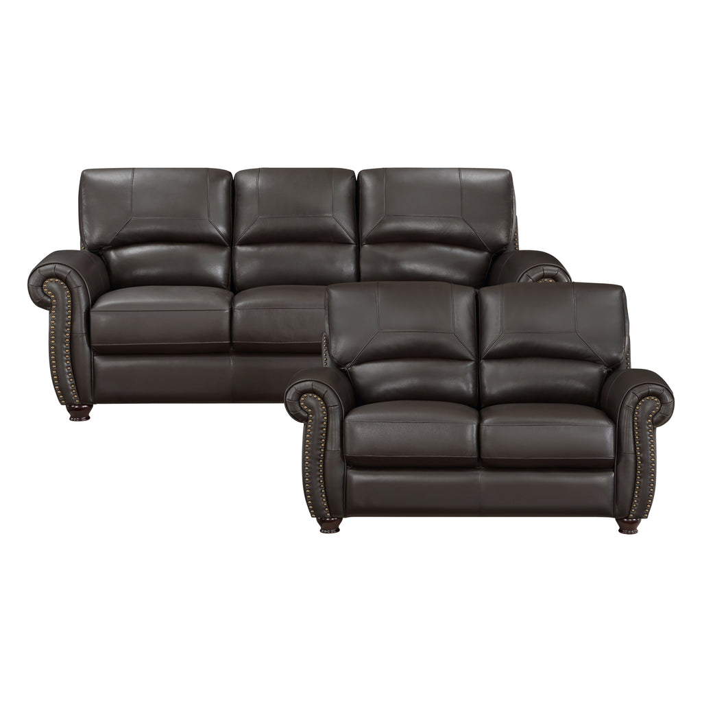 Traditional design and classic accents are paired to create the timeless look of the Foxborough Collection. Cream-hued top-grain leather covers the plush seating of the sofa, love seat, and chair everywhere the hand touches – with faux leather match covering the remaining areas. The profile of the seating arrangement is defined by elegantly rolled arms, plush seatbacks, and nailhead trim.