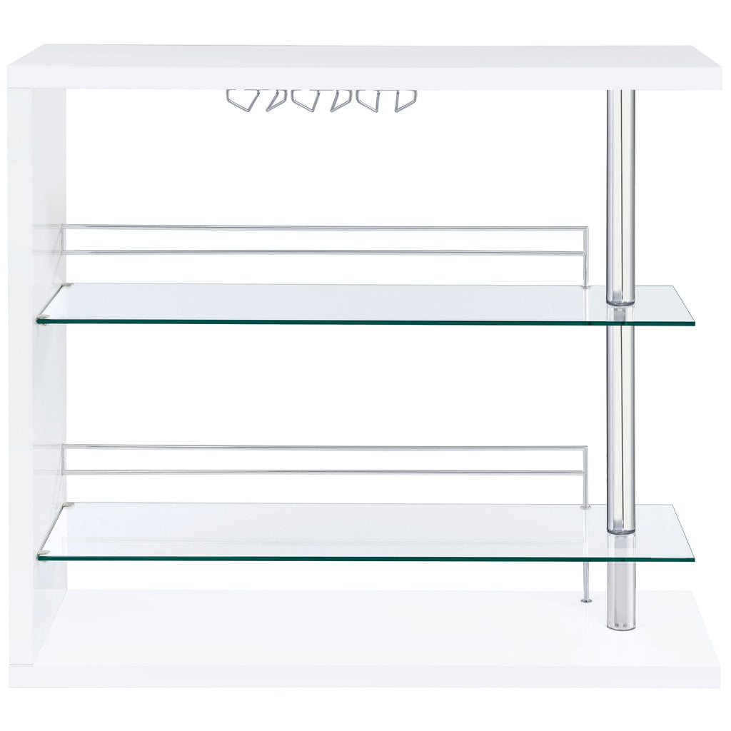 If you love to entertain, you'll love the charm and convenience of this fabulous, contemporary bar unit. With a sleek, stylish design, it looks elegant in a dining area or recreation room. Complete with a gorgeous gloss black finish and shining chrome accents, its bold silhouette makes a striking statement. This handsome unit includes two glass storage shelves for wine, glassware, and bar accessories. A handy wine glass holder rounds out its versatile appeal. Key Features: • Smaller footprint makes this contemporary bar unit a hit • Elegant, clear tempered glass shelves provide strength • Two (2) glass shelves with guardrails and stemware racks add storage and protect the stored items • Steel, MDF, particle board, and laminate construction • Choose from glossy black, glossy cappuccino, glossy white, or weathered grey