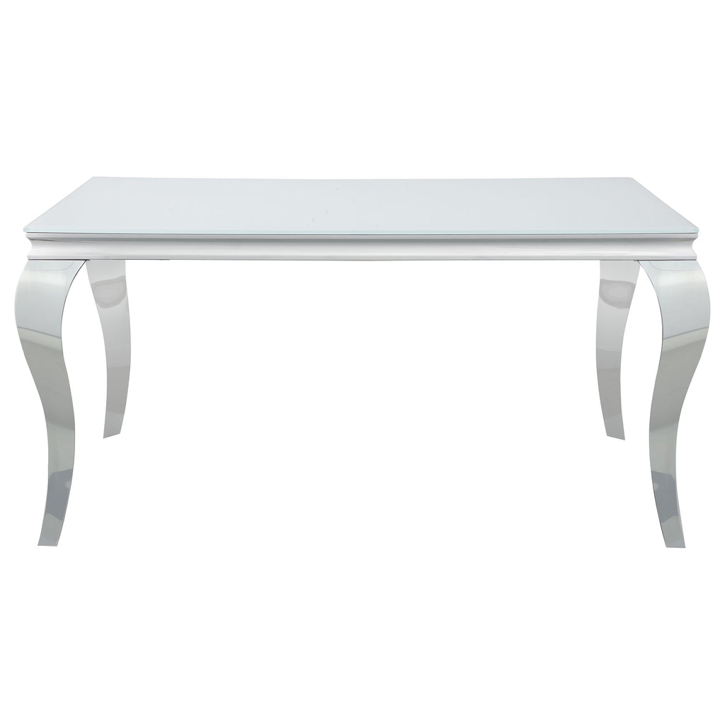 Glamorous with a luxurious touch, this elegant dining table makes the perfect addition to a formal dining space. With a mixed material design of durable stainless steel and glass, this dining table lends itself to several home decor styles. On each traditional Cabriole style leg is a gleaming chrome finish. Gather family and guests around the opaque tempered glass tabletop. In addition, this dining table seats six people comfortably. Key Features: • The look of elite luxury is yours with our stunning dining table crafted from stainless steel, the most durable metal to use for furniture, that will never rust • Luxurious glass and chrome are perfect for a formal dining area or to dress up your everyday dining • Polished chrome finish table base features dramatically curved Cabriole legs topped with white tempered glass • Curved table legs in polished chrome • Stainless steel provides a sturdy frame for this glamorous dining table