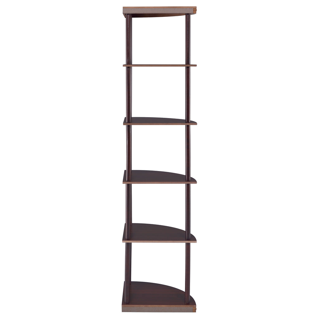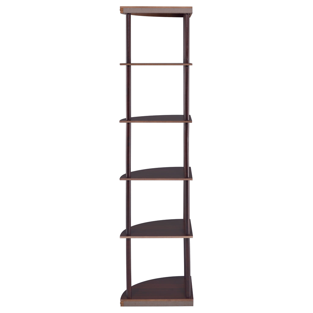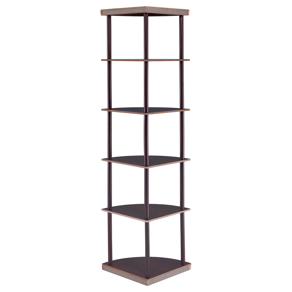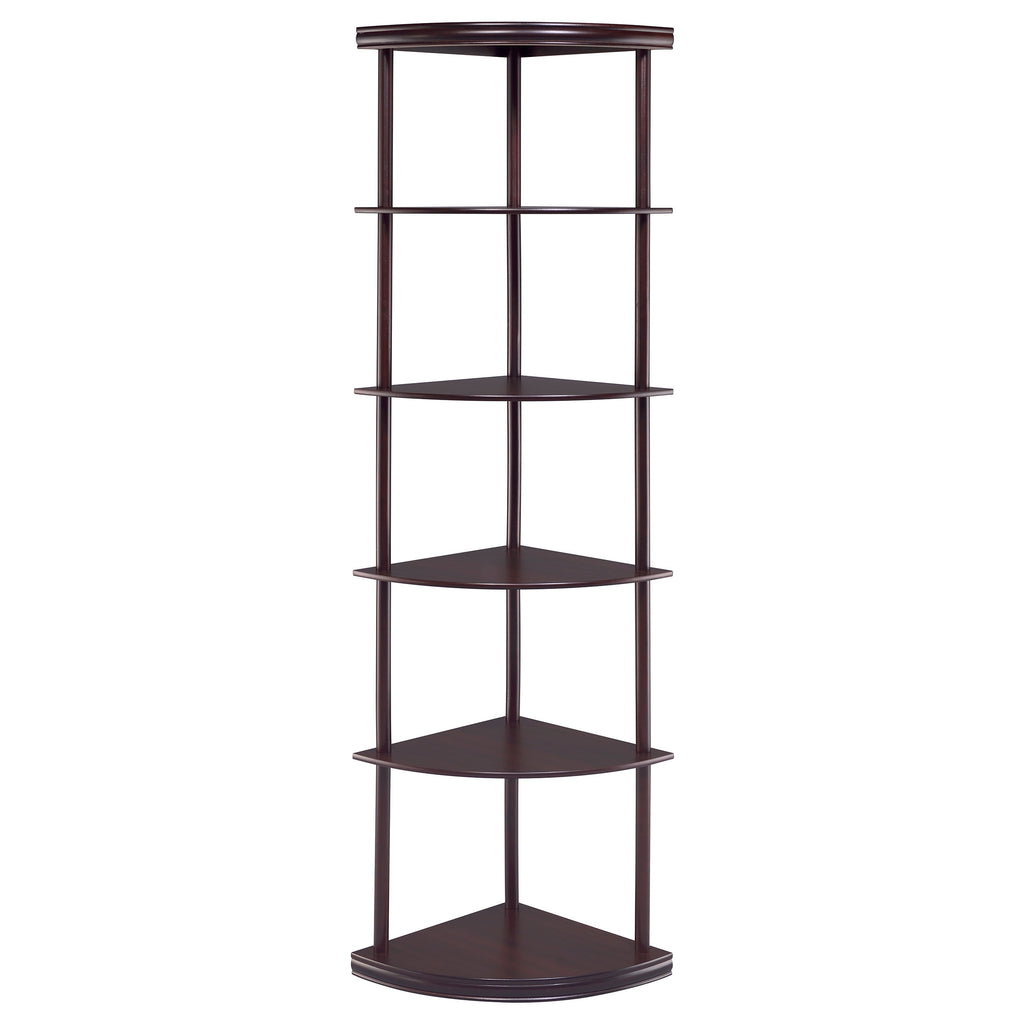 Classy and compact, this four-tier bookcase is a convenient option for a small space. It's designed to fit easily into a corner for space-saving convenience. Made from rubberwood and other high-quality materials, it provides a safe, sturdy spot to display books and keepsakes. A warm, rich cappuccino finish adds elegance and depth. Whether placed in a bedroom, den, or office, this bookcase is sure to enhance any room. Key Features: • Five-tier corner shelf with curved shelves and rich cappuccino finish • Rubberwood and engineered wood construction ensures structural strength • Compact triangular base ideal for small living rooms or bedrooms • Open frame design provides visual lightness and accessibility • Perfect for display in corners with limited wall space • Includes tip-over restraint to ensure safe, stable placement
