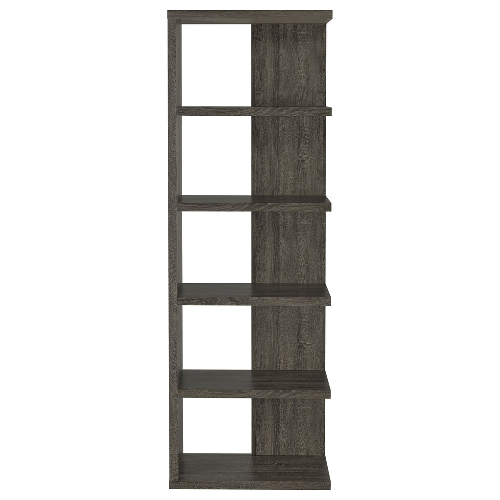 Add a touch of modern charm to any room with this stylish bookshelf in a weathered grey finish. Designed with a mix of open and backed shelving, it brings visual intrigue and versatility to your storage needs. Crafted from engineered wood and finished in eco-friendly melamine veneer, this unit offers five spacious tiers perfect for books, décor, and keepsakes in a contemporary home office or living space. Key Features: • Modern bookshelf with five staggered shelves for stylish organization • Weathered grey finish adds a rustic yet contemporary visual appeal • Open-end shelf design provides dimension and lightness to the silhouette • Ideal for displaying books, framed photos, or small potted plants • Made of engineered wood with a durable melamine veneer for longevity • Compact footprint suits apartments, home offices, or cozy reading corners