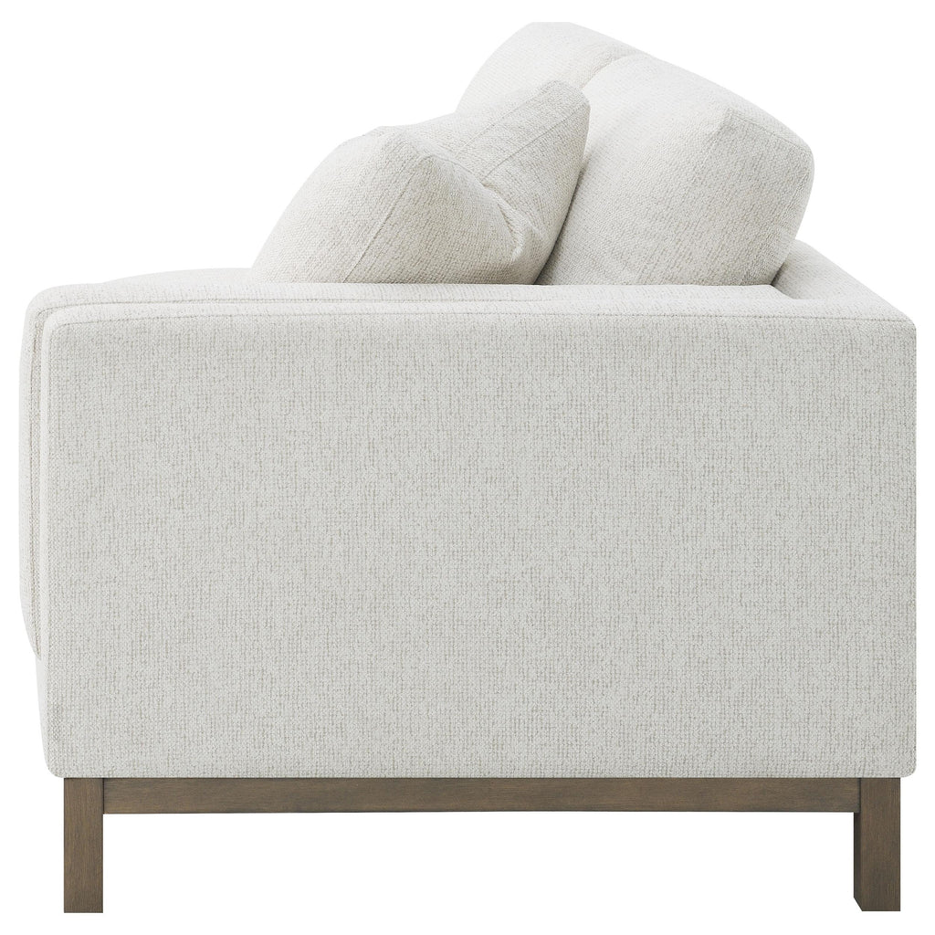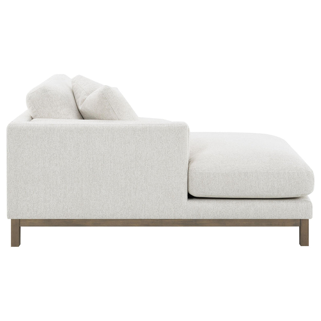 Indulge in the inviting comfort of this modern sectional sofa, thoughtfully designed with a left side chaise to accommodate your personal lounging preferences. Upholstered in a soft, textured bouclé fabric, complemented with a solid wood pedestal base in ash brown, creating the perfect stylish seating foundation. Fulling encased engineered wood frame, sinuous spring seating and foam combined with premium blend fill create a plush, resilient feel. Complete with reversible back cushions, reversible single cushions, removeable chaise cushion and coordinating accent pillows, this sectional becomes the stylish focal point of a welcoming, contemporary living room.