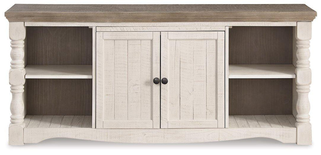 Set your sights on modern farmhouse style with this entertainment center. Distressed two-tone treatment blends a weathered gray with vintage white for an utterly charming effect. Turned posts lend a hearty, substantial look that feels right at home, while plenty of open shelving makes the aesthetic anything but heavy.