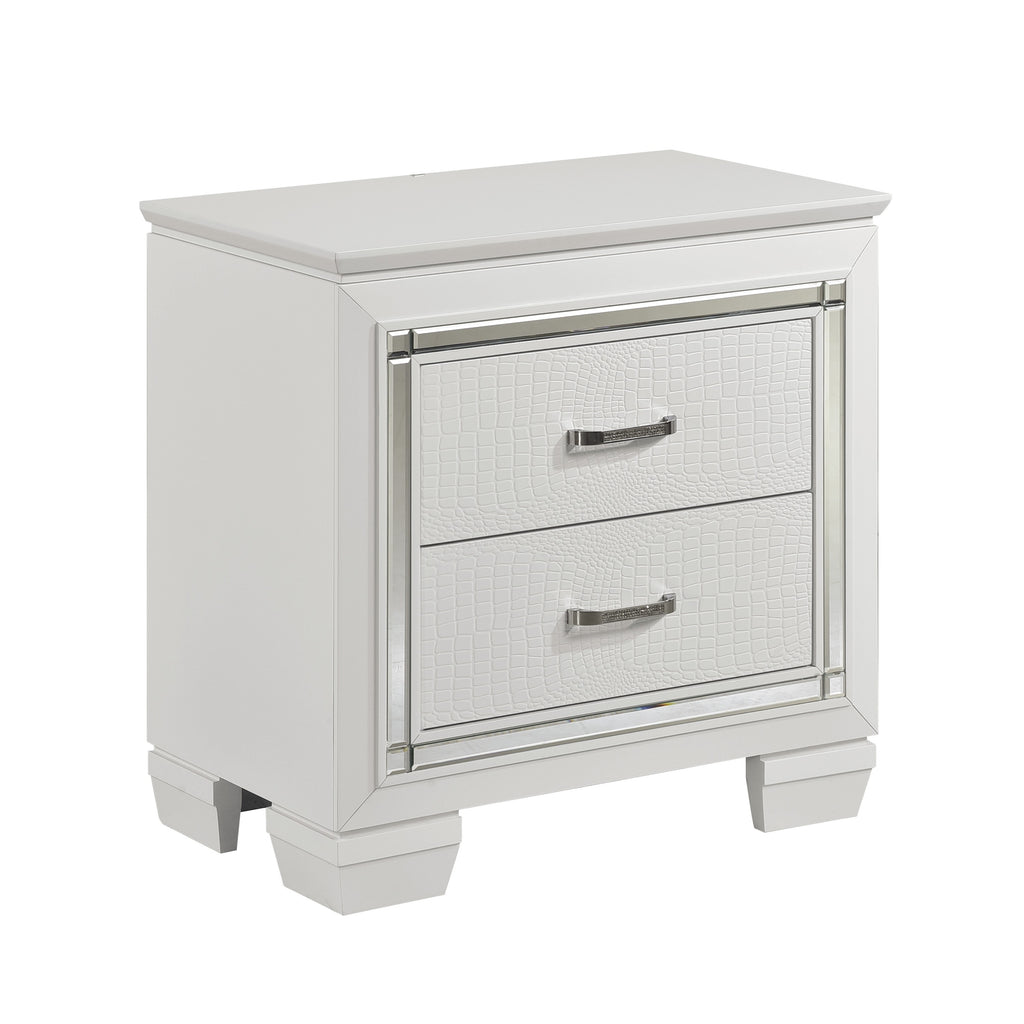 Glamour reigns in the design of the Allura Collection. Framing the nightstand is a decorative beveled mirror accent that enhances the illumination from the touch-engaged LED backlight of the nightstand. Alligator embossing and high polished crystal-enhanced hardware boldly accent the white finish.