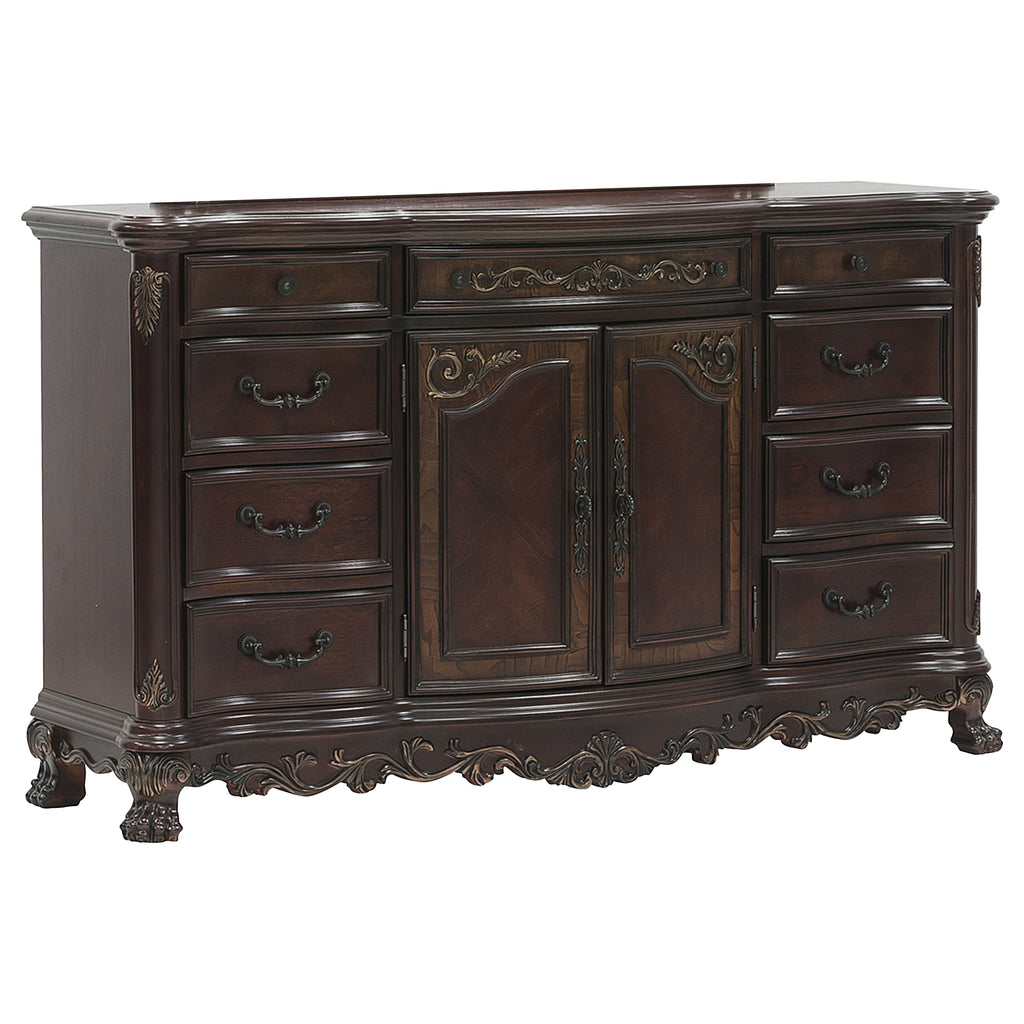 Walking into the bedroom that is occupied by the Deryn Park Collection immediately displays your love of the traditional aesthetic. Design elements include burl inlay, traditional bale and knob hardware, claw feet and shell motifs. The cherry finish is highlighted by gold tipping that accentuates the traditional feel of elegant Deryn Park Collection.