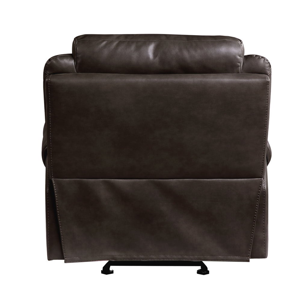 With amply appointed offerings that create not only a comfortable seating experience but a functional one as well, the Aram Collection will be a welcome addition to your home. Dark brown breathable faux leather covering for comfort and style that will blend effortlessly with your transitional decorative preference. Manual motion mechanisms operate with the pull of a side-mounted tab, that once engaged, take you from seated to reclined in an easy motion. The reclining chair features a glider mechanism that allows for easy back and forth motion.