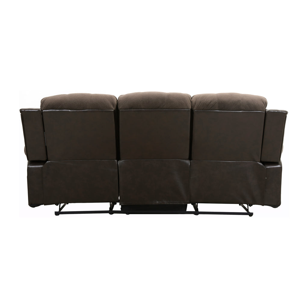The reclining Cranley Collection utilizes a release mechanism that with a gentle pull sends you straight into your ultimate comfort zone. Chocolate textured plush microfiber with faux leather.