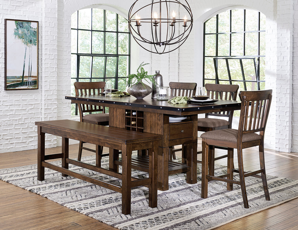 Transitionally styled with a burnished brown finish, the Schleiger Collection features bold accenting and functional storage options. The available counter height bench allows for versatile seating configurations.