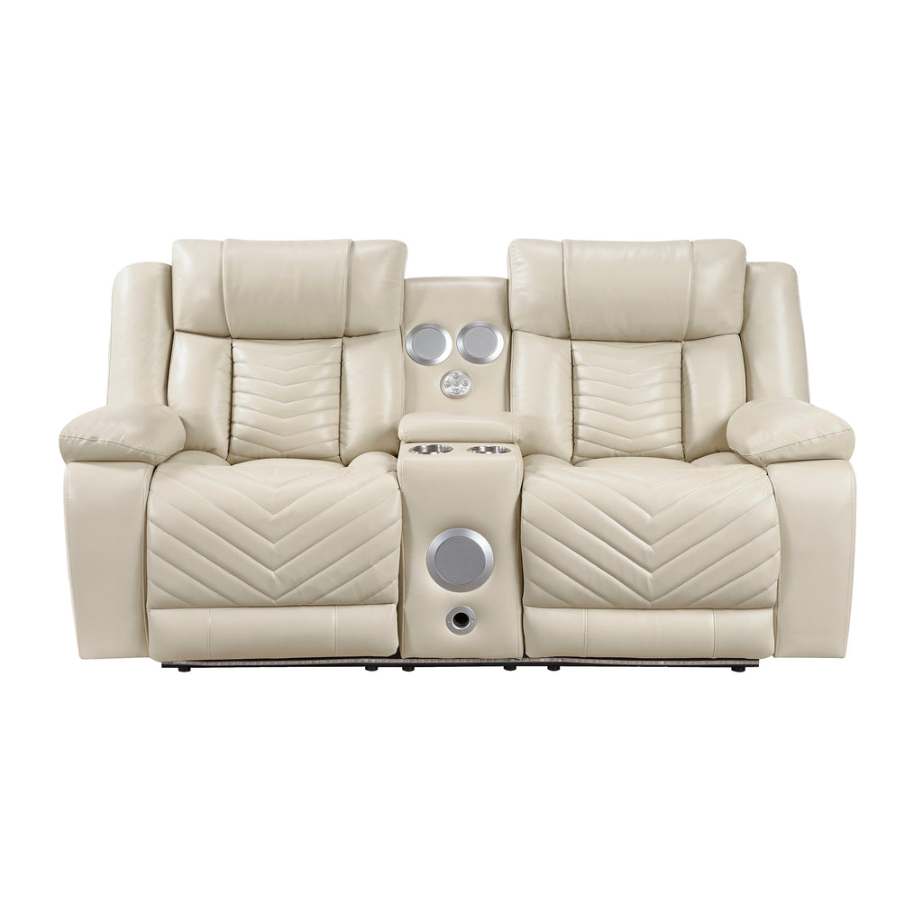 Experience unparalleled comfort and entertainment with our luxurious double power recliner. Designed for shared relaxation, this recliner features individual one-touch power controls for customizable reclining positions, ensuring both you and your partner find the perfect level of comfort. The built-in center console adds a touch of convenience with two cup holders, hidden storage, and integrated wireless speakers for immersive audio. Stay connected with integrated charging ports and set the mood with ambient LED lighting underneath. Upholstered in premium faux leather with stylish V-pattern stitching, this recliner is both elegant and durable. The robust solid wood and plywood frame, reinforced with metal and foam padding over pocket coils, provides exceptional support and stability for up to 300lbs per seat.