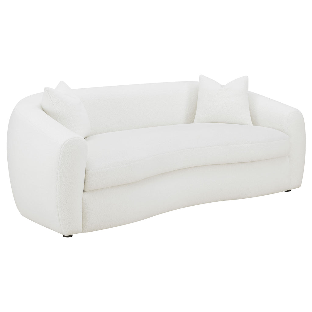Create your modern entertaining area with this contemporary natural seating set, designed with a boucle fabric across its cloud-like contoured frames, sloped armrests and curved bench seats. Coordinating boucle accent pillows with premium faux down fill offer the finishing touch and extra comfort as contrast bold black legs hidden below elevate each seat ever so slightly.