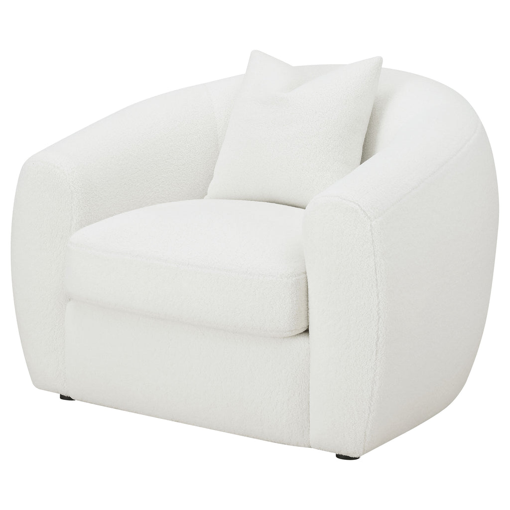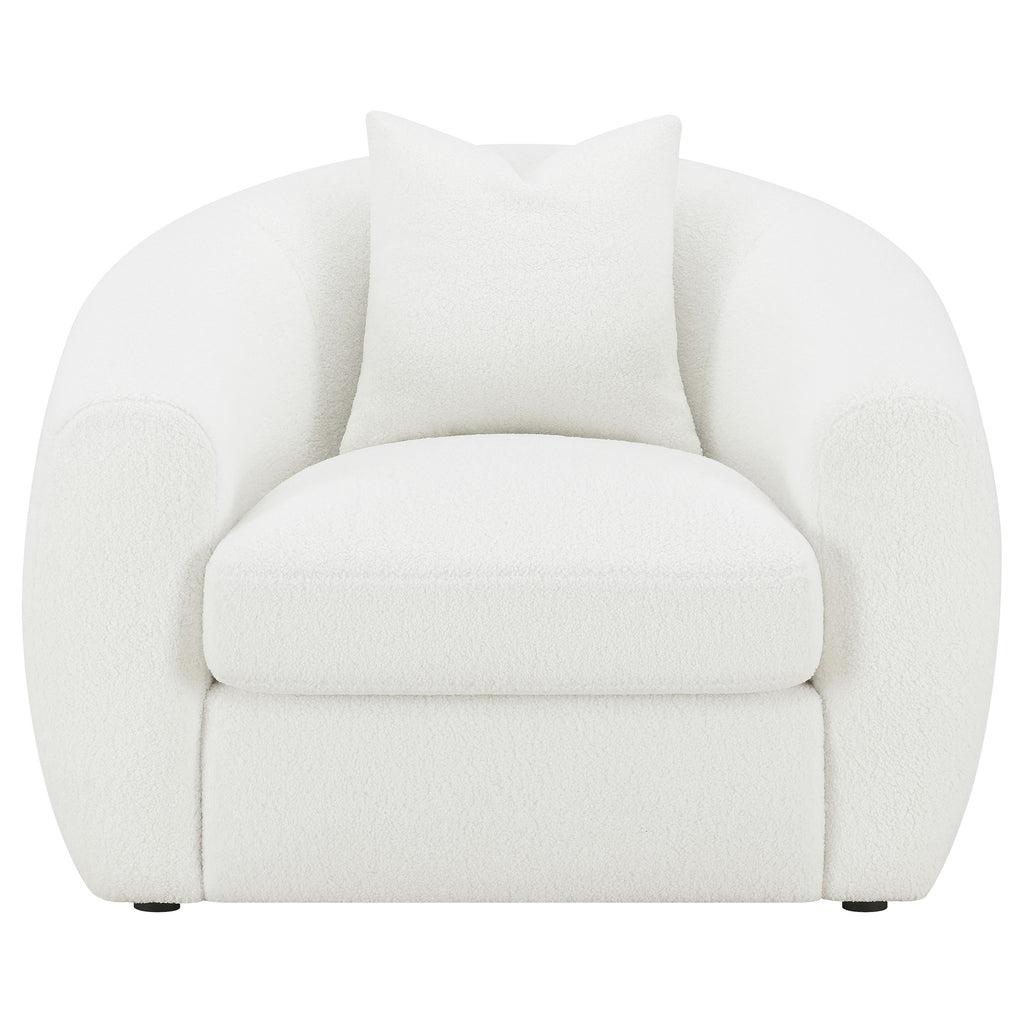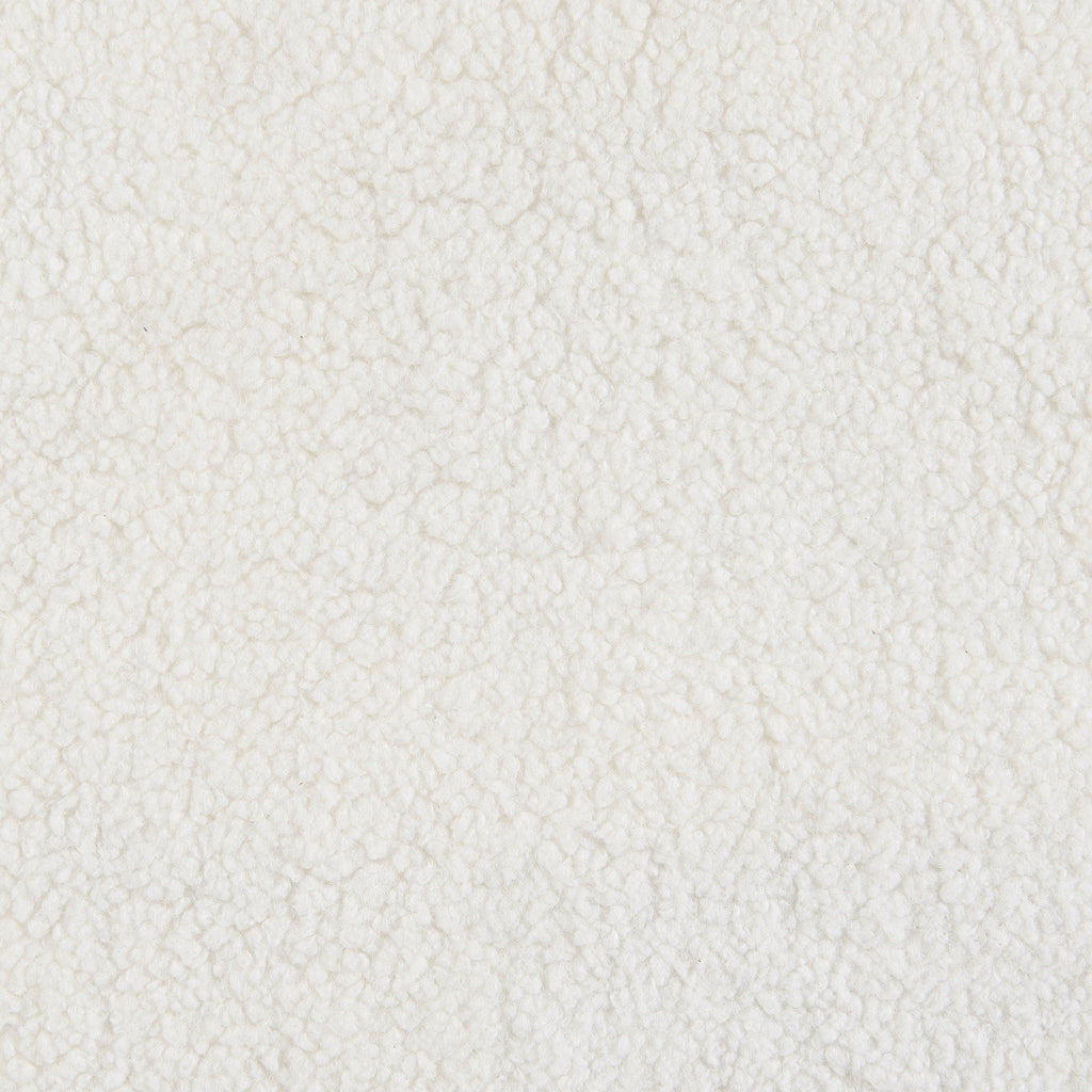 Elevate your modern living room with this cheerful, contemporary natural lounge chair, upholstered in a white teddy boucle fabric across its elegantly curved silhouette and sloped armrests. A single accent pillow in a matching boucle rests against the bench cushion and tailored backrest as discreet bold black legs offer a slight elevation.