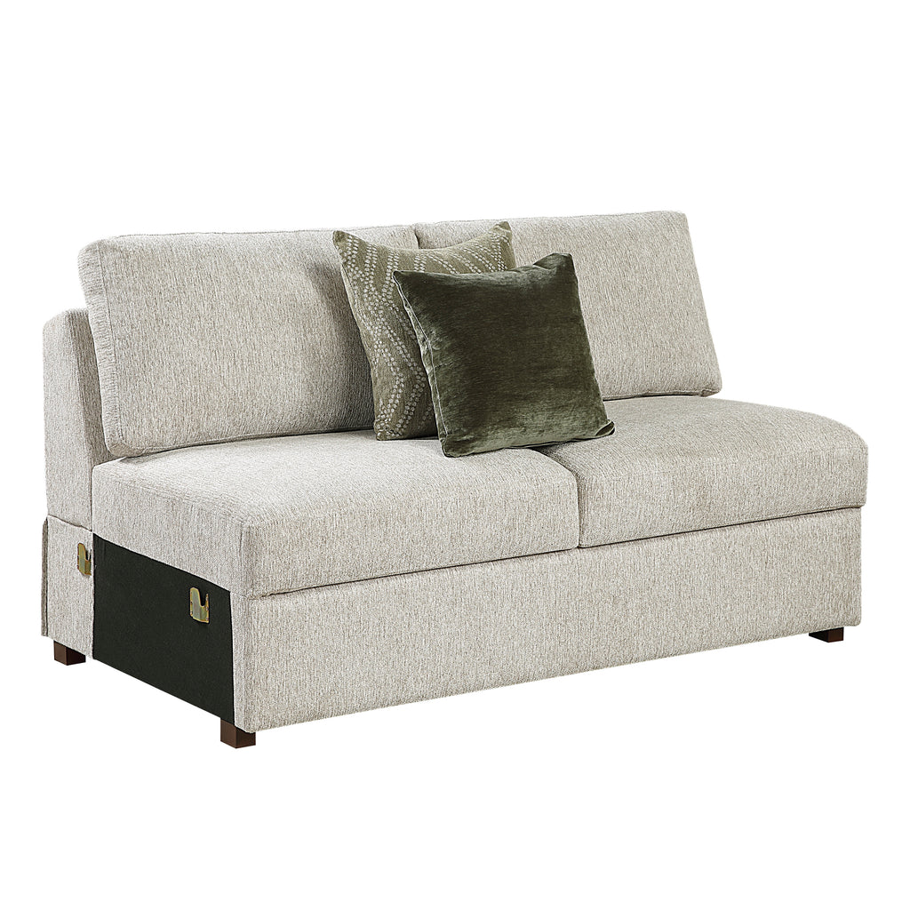 Maximize your living space with the adaptable and comfortable 4-piece sectional with pull-out bed and ottoman. Upholstered in a soft-to-the-touch textured microfiber, this versatile set includes a 2-seater with a hidden pull-out bed, a cozy corner seat, another spacious 2-seater, and a convenient storage ottoman. Perfect for both everyday lounging and accommodating overnight guests, this sectional offers ample seating for family and friends. The durable plywood frame ensures long-lasting stability, while the high-density foam padding over pocket coils provides exceptional comfort and support. Finished with solid wood feet in an elegant espresso hue and accompanied by six plush décor pillows, this modular sectional is a stylish and functional addition to any modern home.