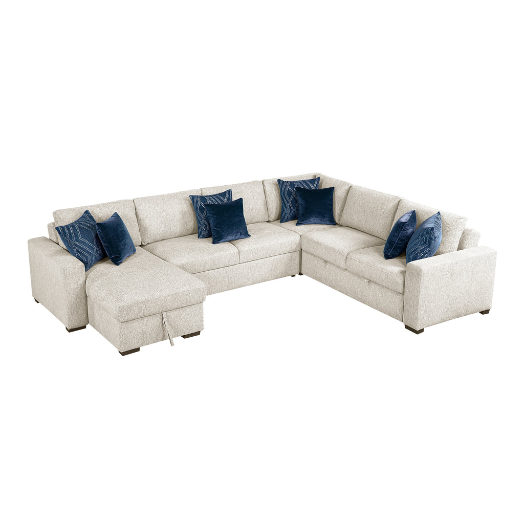 Transform your living space with the adaptable and comfortable 4-piece sectional featuring a convenient pull-out bed and a chaise with hidden storage. Upholstered in a soft yet durable textured microfiber, this modular design includes a comfortable 1-seater, a space-saving corner seat, a versatile 2-seater with a hidden pull-out bed, and a chaise offering discreet storage. Perfect for maximizing seating and accommodating overnight guests, this sectional provides both style and practicality. The durable plywood frame ensures lasting stability, while the high-density foam padding over pocket coils delivers exceptional comfort and support for everyday lounging. Accented with six plush décor pillows and supported by solid wood feet in a rich espresso finish, this sectional is an ideal centerpiece for any modern home.