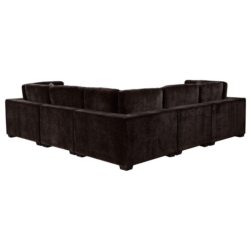 Sink into comfort with a modern, modular sectional sofa with an included ottoman. Plush cushions create exceptional comfort and support, wonderful for lounging or catching up with friends. The sectional displays an on-trend silhouette complete with wide track arms and block feet. The velvety soft upholstery is the perfect choice for a family room, creating a cozy ambiance. Its color palette is modern and versatile, easily complementing a variety of spaces and surrounding decor motifs. Key Features: • This sectional with a modern design is perfect for a contemporary living space dedicated to entertaining. • Quality wood framing of its boxy base creates a sturdy, supportive venue for comfortable seating • Soft, durable fabric upholstery is pleasing to the touch and versatile to embellish all spaces • Plump full-foam cushion filling and sinuous spring seating enhance comfort and support • Charming legs are constructed of quality wood and given a tapered silhouette