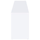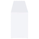 Create plenty of storage to accompany your large screen television with this modern TV stand. Designed to host a TV up to 85 inches, it's a long, linear structure with clean, precise lines that blend into most spaces. Its neutral finish complements melamine surfaces that add durability, perfect for a family living space. Four doors open to reveal interior shelving that's adjustable and includes cord management openings for easy organization of media and gaming components. Use the added shelving for accessories and media in your tidy, organized space.