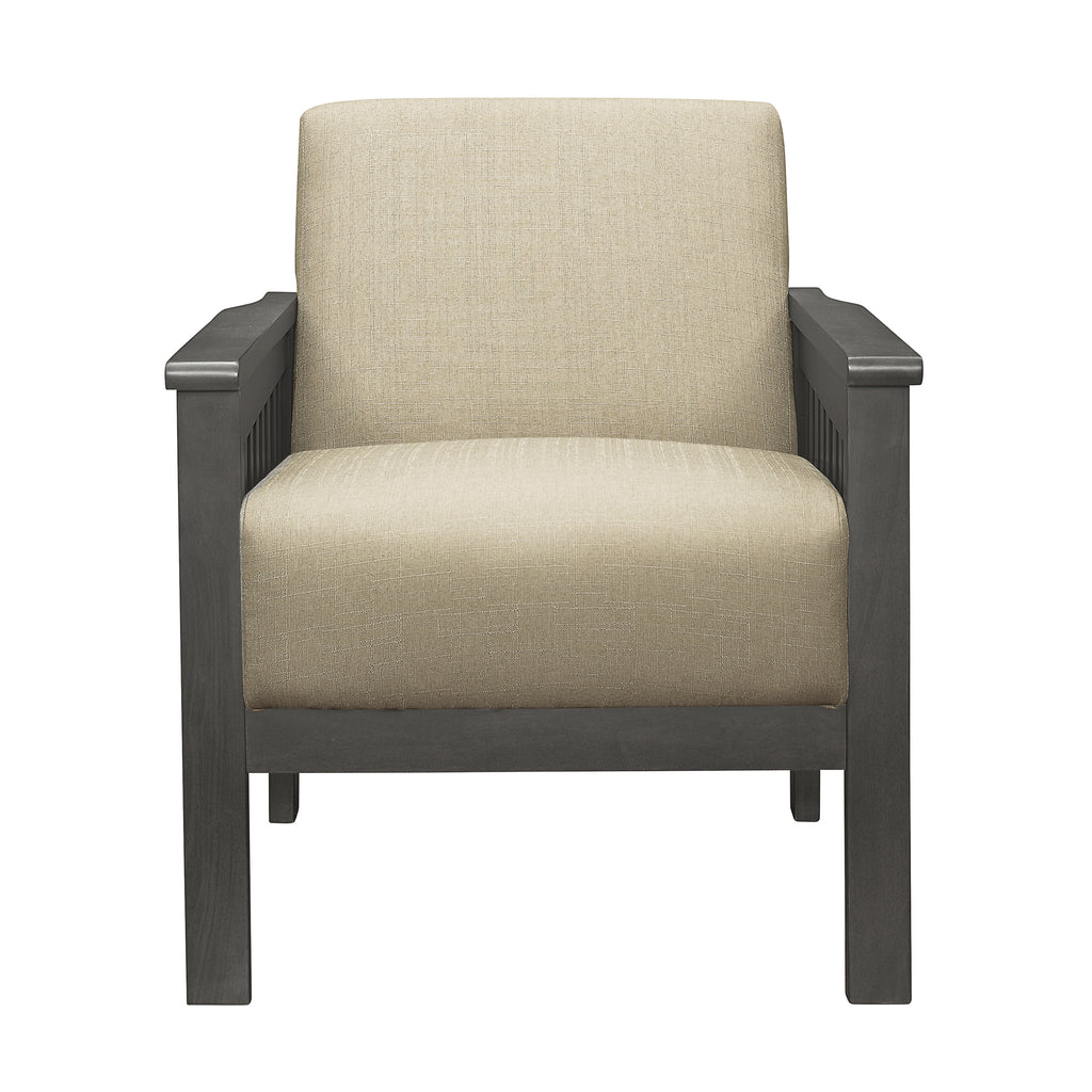 Designed with inspiration from the Arts & Crafts movement, the Lewiston Collection will be a classic addition to your home’s décor. The chair's transitionally styled legs and vertical slat-supported wood arms are finished in an antique gray, providing complementing contrast to the brown linen-like fabric covering.
