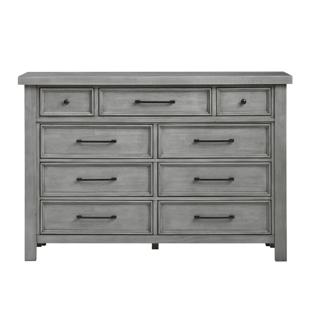 The transitional framing of the Logandale Collection allows for versatile placement within a number of classic bedroom decors, making a perfect choice for your home. An antique gray finish is utilized over mango veneer for subtle highlighting of its distinct grain. Dark finished metal knob and pull hardware front each drawer of the dresser, creating a complementing accent to the collection.