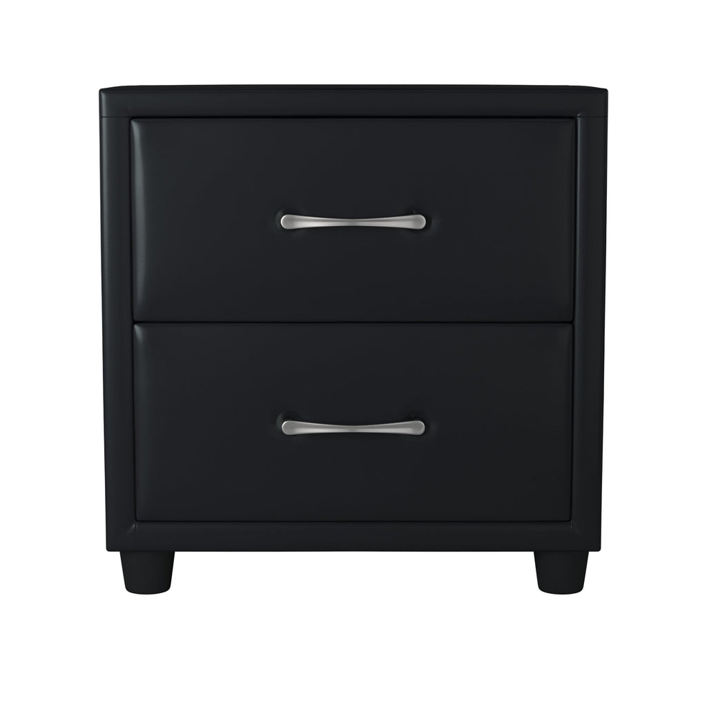 The contemporary design of the Lorenzi Collection is enhanced by the addition of the durable black faux leather covering of the nightstand’s exterior. Silver tone hardware provides a distinct contrast to the finish of the nightstand’s surface. Scaled for urban living, this collection will provide a unique and stylish addition to your bedroom.