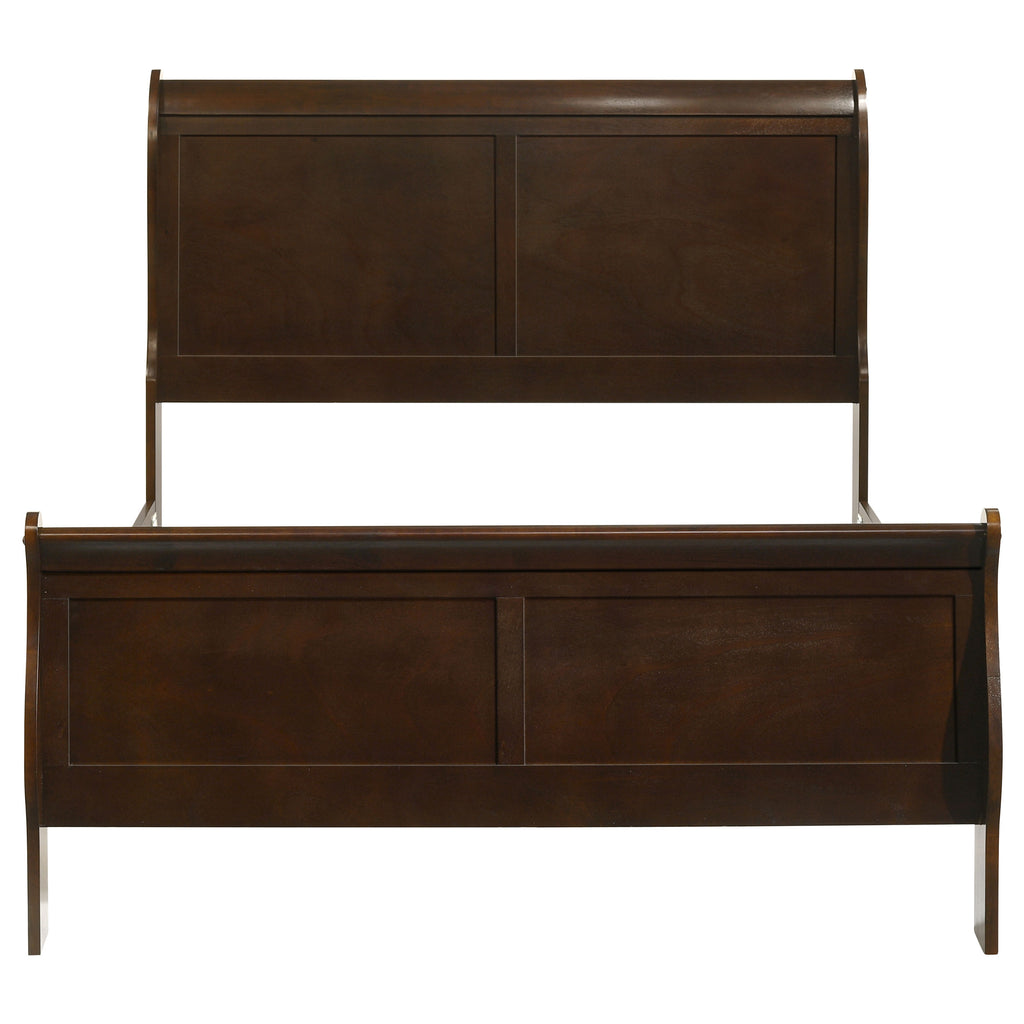 Marry modern and classic design with the rich hues and clean lines from this cappuccino queen bed. Showcasing classic louis Philippe style, the headboard is slightly higher than the footboard. Geometric shapes constructed from wood veneer and select hardwoods make up the frame. With an exposed wood grain, the warm coloring creates a welcoming aura in a bedroom. Thin, delicate legs complete the sophisticated look. Key Features: • Queen bed featuring a modern take on classic Louis Philippe design • Constructed from wood veneer and select hardwoods for durability and longevity • Showcases a rich cappuccino finish with exposed wood grain for a warm, welcoming aesthetic • Headboard is slightly higher than the footboard, adding a geometric touch to the design • Supported by thin, delicate legs for a sophisticated and elegant look