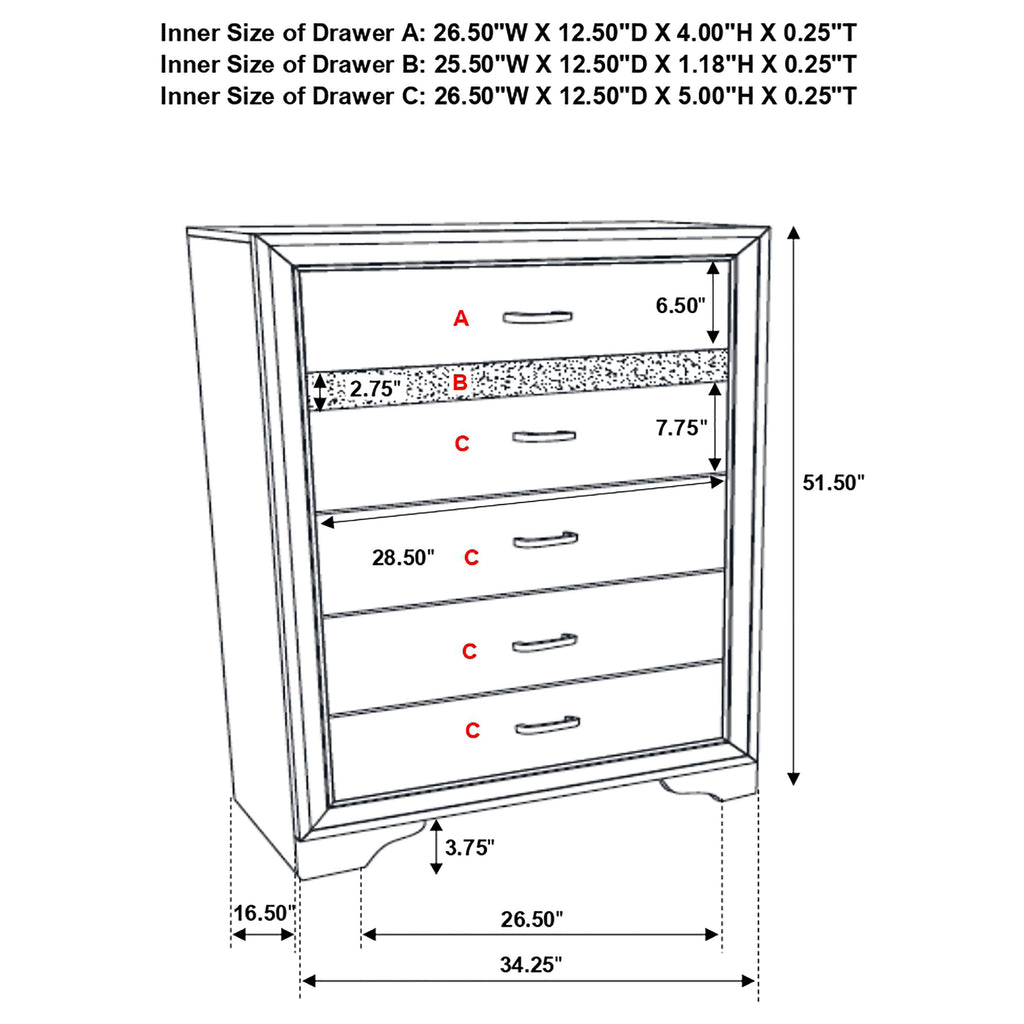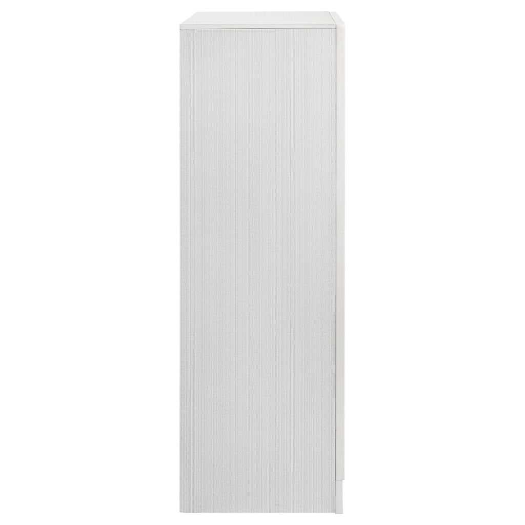 Add posh, upscale ambiance to your bedroom decor. This chic, stylish chest livens up a room with a dazzling touch of sparkle. With a hidden jewelry drawer built in, it keeps valuable items safe and secure. Its drawers are lined with felt for a luxurious hint of softness. Its six convenient drawers are built with metal extension glides for versatile ease of use. Key Features: • Six spacious drawers offer practical vertical storage • Hidden felt-lined drawer concealed behind glitter accent • Crystal drawer pulls bring added shimmer and texture • White finish with subtle side panel texture • Metal-extension drawer glides for everyday ease • Engineered wood frame with laminate veneer surfaces