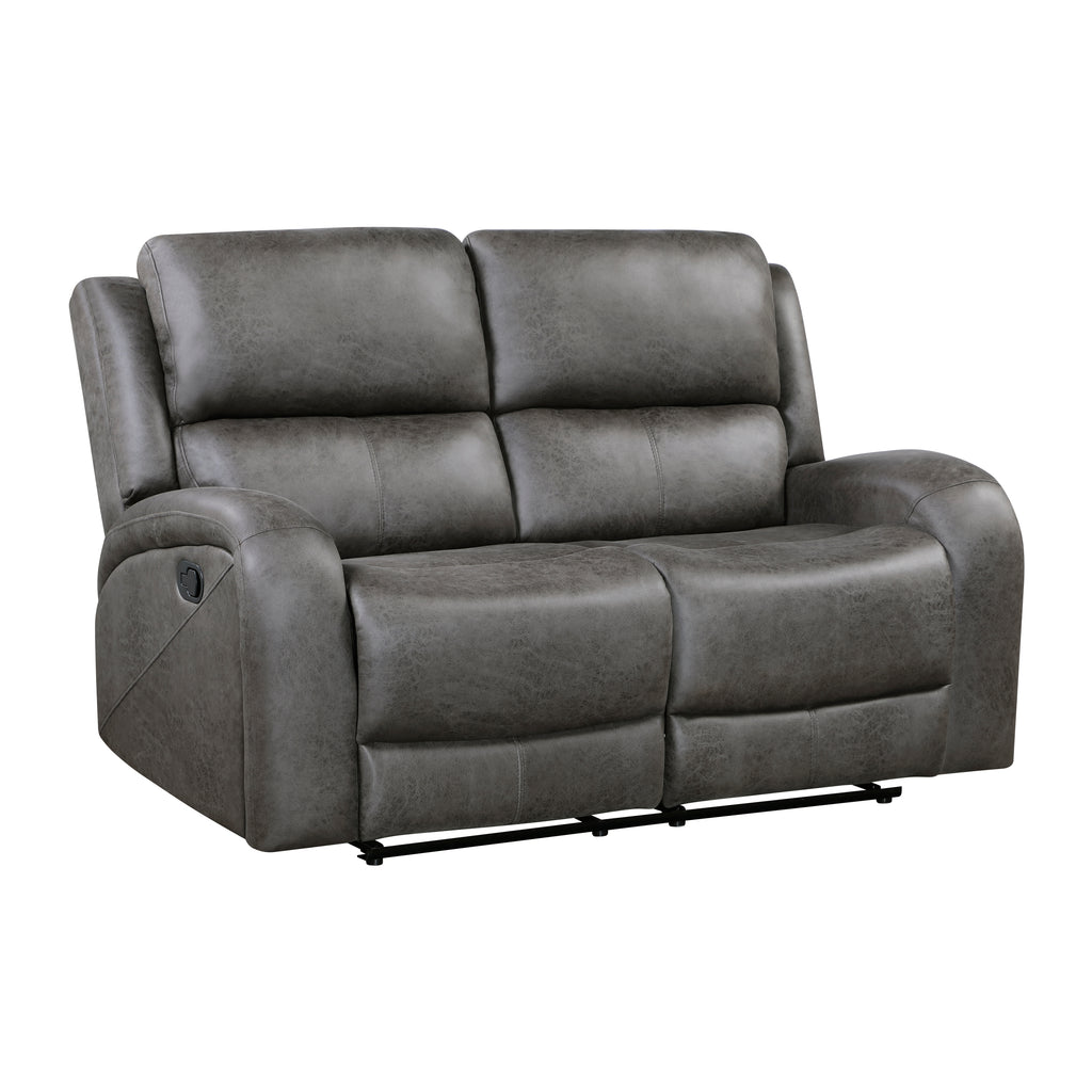 Transitional style is exemplified in the Pagosa Collection, its design pairing plush contoured seating, and versatility of style to create a relaxing space within your home’s living room. The plush contoured profile of the collection is covered in gray polished microfiber. With a pull of the side mounted tabs the dual end reclining mechanisms are engaged easing the love seat into the prone position.
