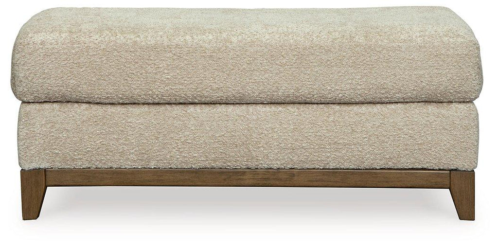 Serene style with a modern sensibility. Delight in the cozy, versatile embrace of this ottoman. It takes an on-trend approach to irresistible texture and natural beauty, showcasing soft upholstery accented with a transitional wood trim. As refined as it is laid back, the ottoman also keeps comfort a priority with a plush, thick cushion.