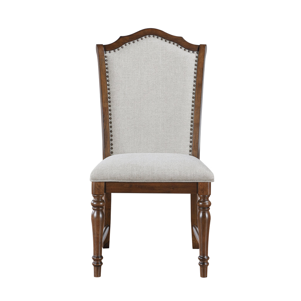 The subtle traditional design defines the profile of the Rexford Collection creates a timeless addition to your home’s formal dining space. The wood-framed side chair features nailhead trim, and gray fabric upholstered seat and back. Cherry veneer is highlighted with a cherry finish solidifying the collection’s classic aesthetic.