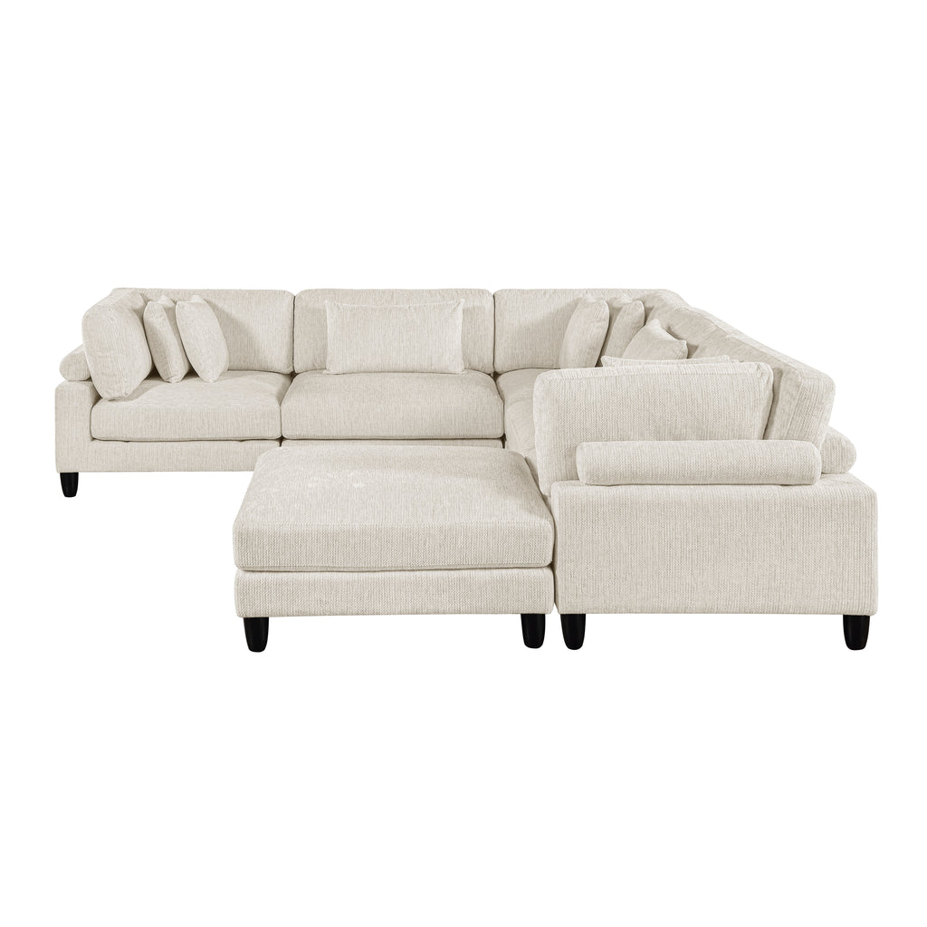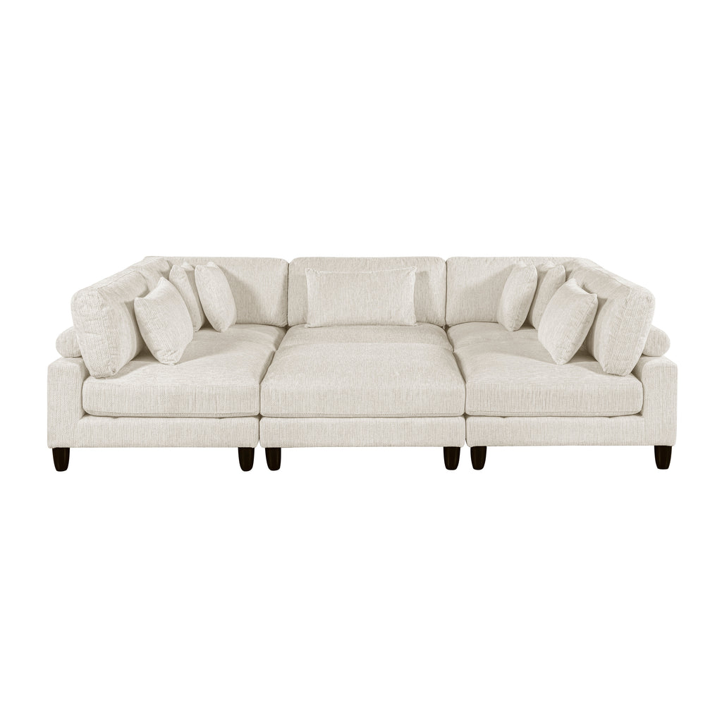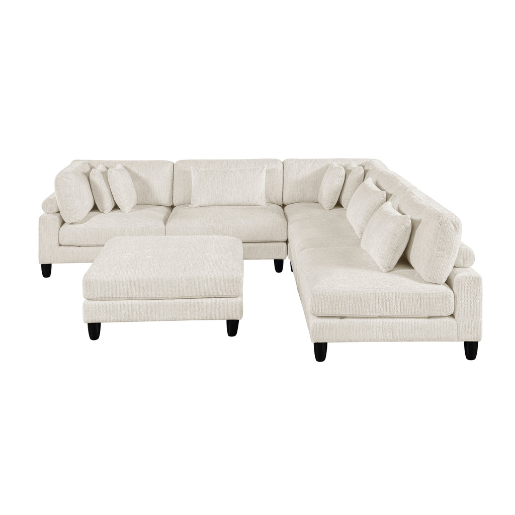 Design your ideal living space with this versatile and comfortable 6-piece modular sectional sofa with an ottoman. This set includes two corner seats, three armless chairs, and one ottoman, allowing you to arrange them to perfectly fit your room's layout. Built on a sturdy solid wood and plywood frame, each piece is engineered for durability and reliable support, with a weight capacity of 300lbs per seat. The plush foam padding over pocket coils and soft textured microfiber fabric upholstery provide an exceptionally comfortable and resilient seating experience. Designed for easy maintenance, the reversible cushions have convenient zipper covers for simple cleaning. Complete with seven coordinating decorative pillows, this sectional is the perfect blend of modern style, practical functionality, and luxurious comfort.