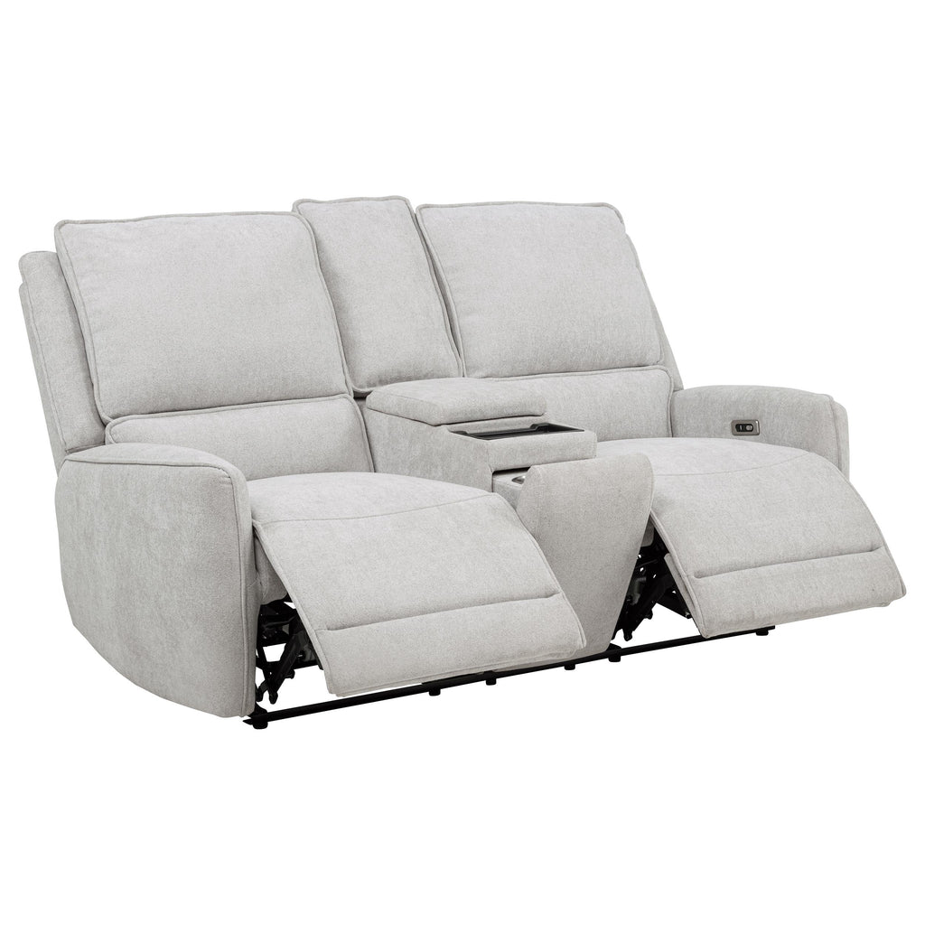 This reclining loveseat captures the essence of cozy sophistication, designed for shared moments and quiet indulgence. Outfitted in plush dove grey chenille, its smooth, sculpted form invites relaxation at the push of a button. Dual power recliners extend effortlessly, controlled by integrated side buttons, while a center console with hidden storage and cup holders adds functional ease. Built atop a sturdy wood and metal frame, it offers enduring comfort for two. Key Features: • Power reclining loveseat with sculpted seats and plush cushioning for two • Dove grey chenille upholstery adds softness and a contemporary neutral palette • Dual push-button recliners offer smooth electric motion on both sides • Center console includes hidden storage compartment and dual cup holders • Anti-pinch mechanism pauses recline when contact is detected for added safety • Foam-padded seating and backrests wrapped in soft polyester chenille