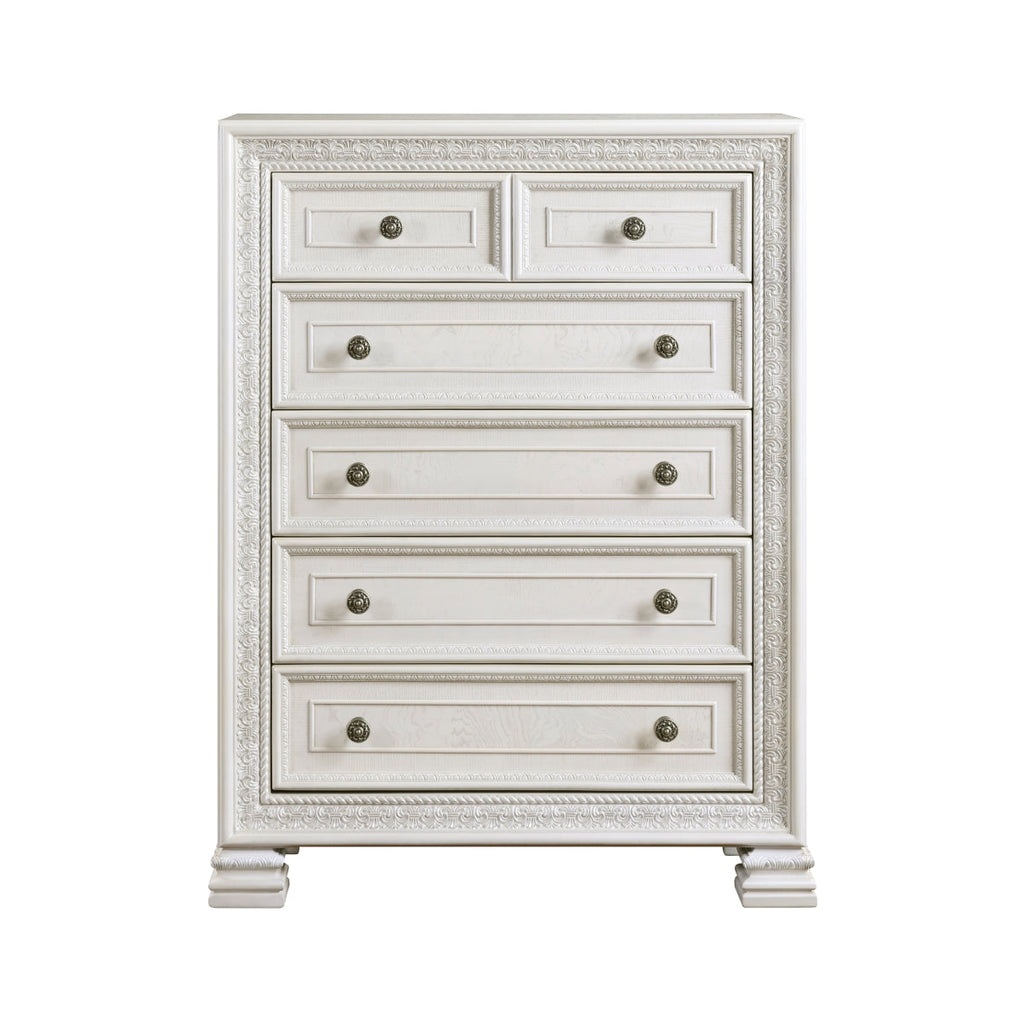 Modern Classicism is defined in the elegant presentation of the Theodora Collection. The treasured themes of old-world accenting – egg and dart molding, acanthus detailing, rope molding, detailed knob hardware – front the chest, the timeless style enhanced by the modern pearl white finish over the collection’s ash veneer.