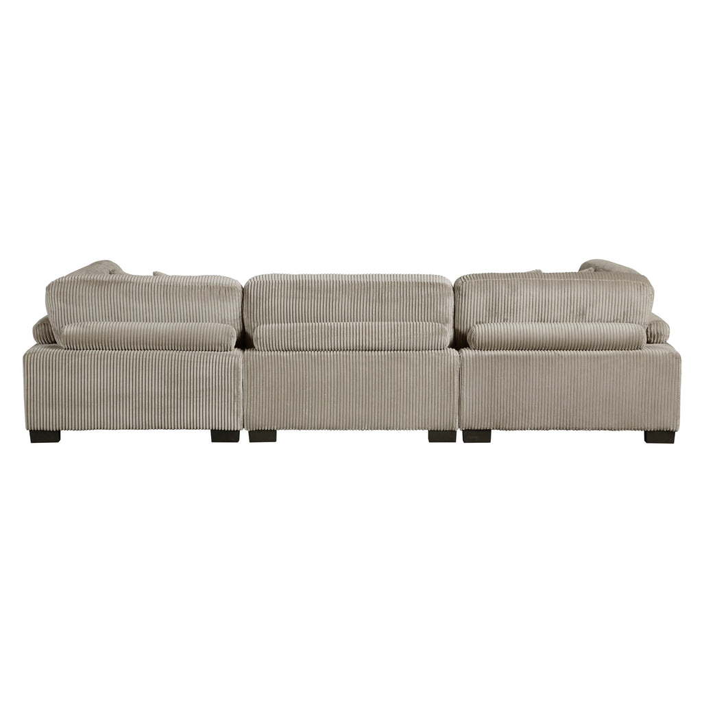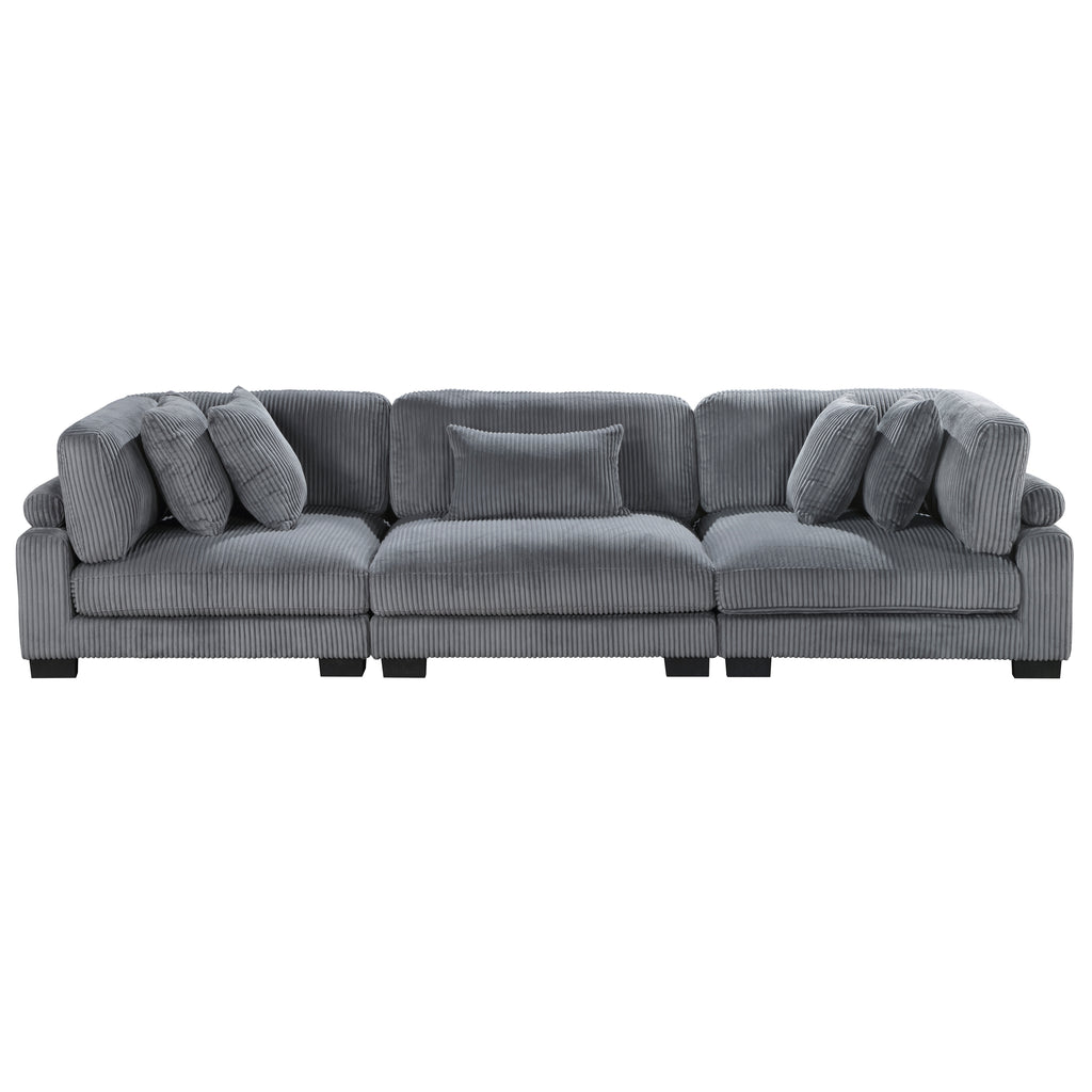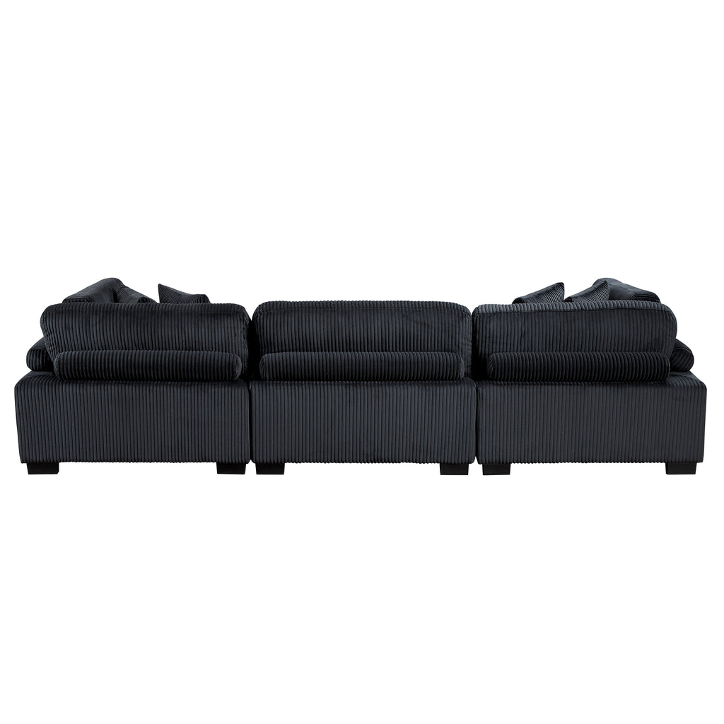 Configurable to your available space, the Traverse Collection allows for the addition and detachment of pieces for a customized seating experience. The sofa configuration consists of two corner units paired with a centrally placed armless chair. The plush black corduroy fabric upholstery creates a plush expanse for a soft touch experience.