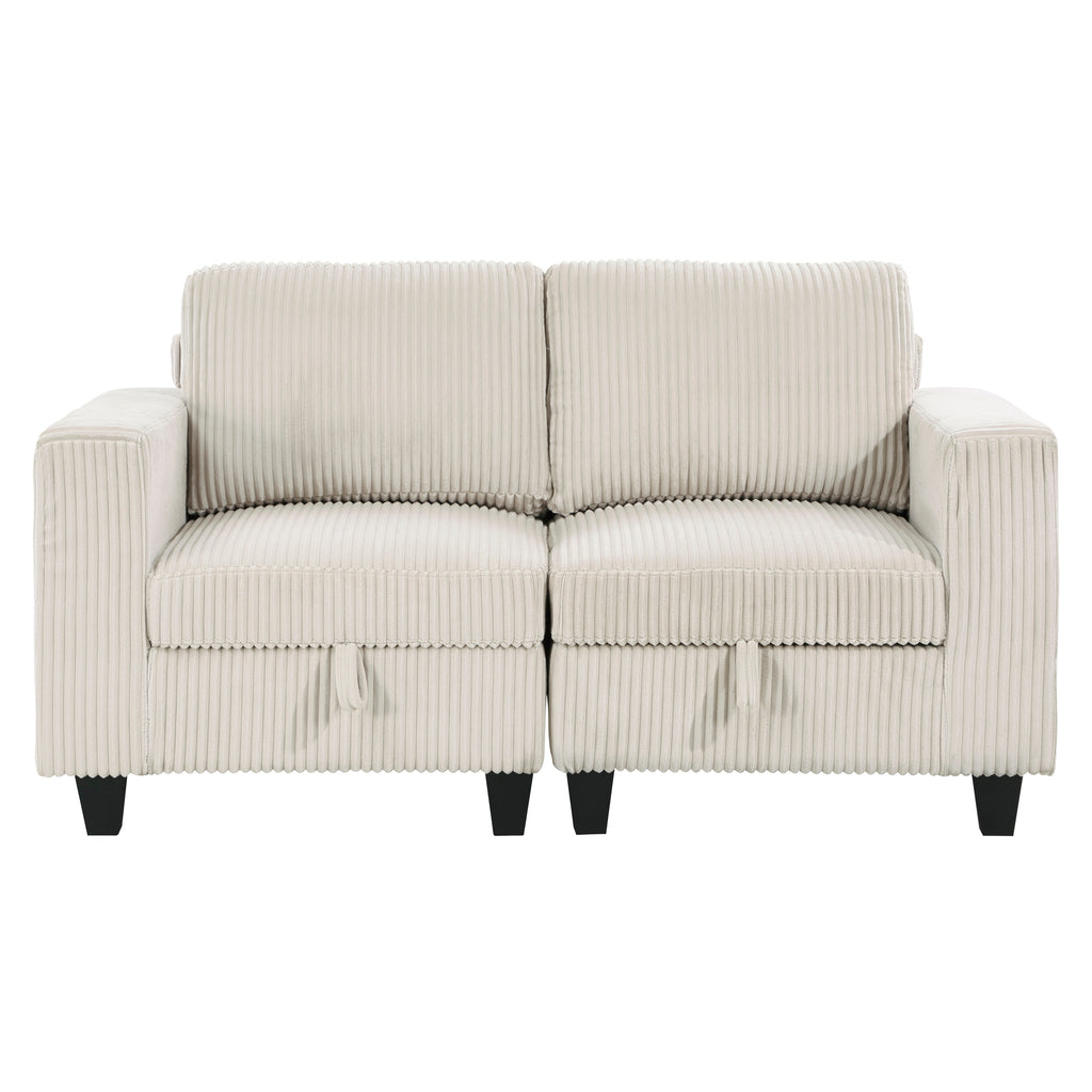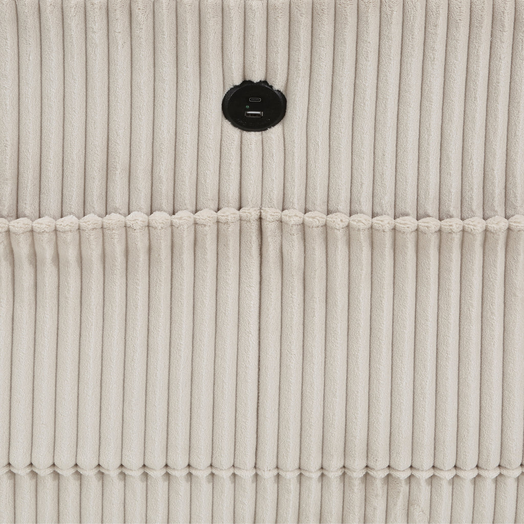 The multifunctional design of the Walterboro Collection creates a seating group that is not only configurable to your available space but serves as a convenient storage spot within your casual living room. Pull-out storage drawers are neatly tucked beneath the seats of the love seat, each drawer easily accessible with a pull to the front-mounted loop handle. The paired end seats arm's provide side support and power charging ports. The collection is covered in beige corduroy fabric for a neutral complement to your home’s décor.