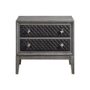 Modern styling is achieved by pairing classic design elements with eye-catching bold lines culminating in the chic look of the West End Collection. Painted silver accent subtly frames the diamond-patterned gray faux leather fronts of the nightstand, each providing complementing contrast to the gray wire-brushed finish of the collection’s birch veneer. Square nickel finished hardware fronts each drawer, furthering the modern look of the West End Collection. 29 x 17 x 27H