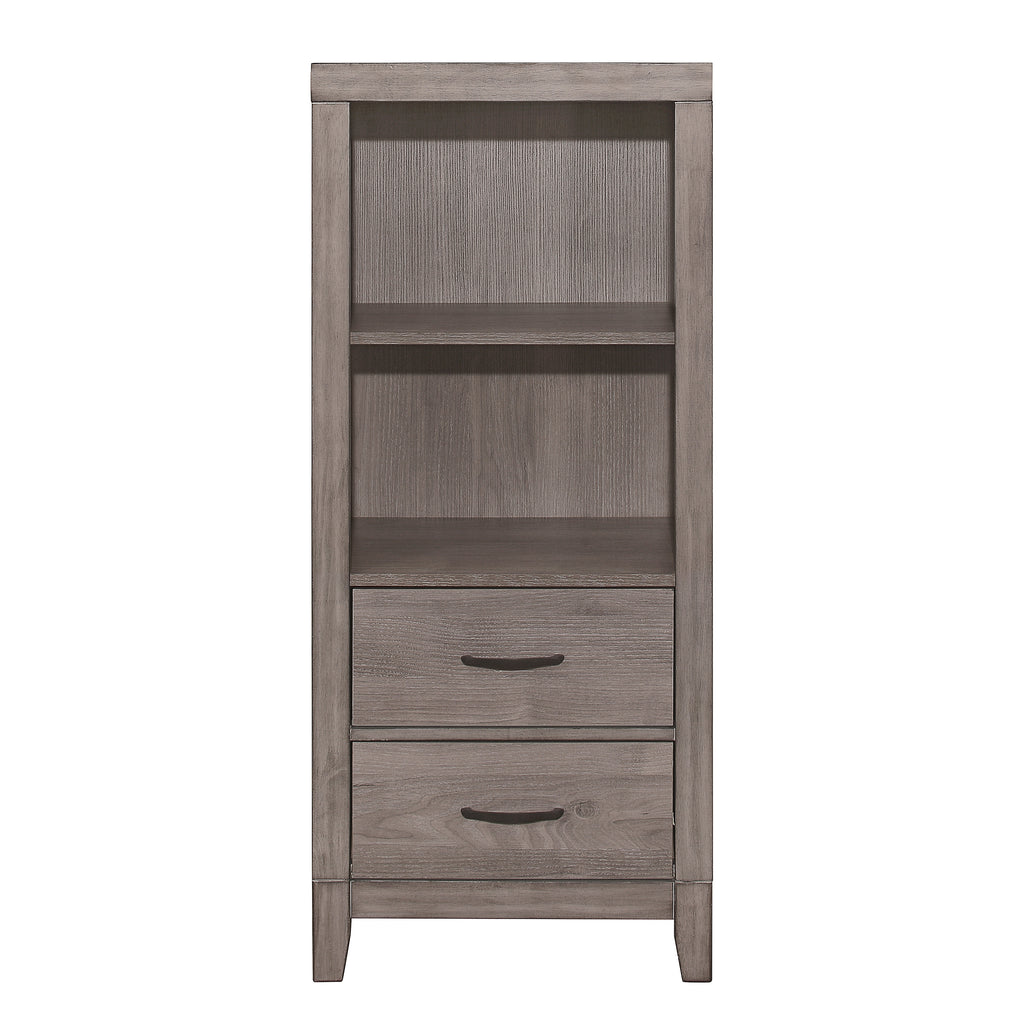 Industrial design is subtly used to achieve a cool look for your bedroom in the Woodrow Collection. Dark metal hardware and corner banding with rivet look lend to the casual look of this bedroom group. Melamine laminate features a weathered-wood look that furthers the intended design. The bookcase headboard provides ample space for your bedside storage needs. Further functionality comes in the form of an optional tower night stand and under-bed toy boxes.